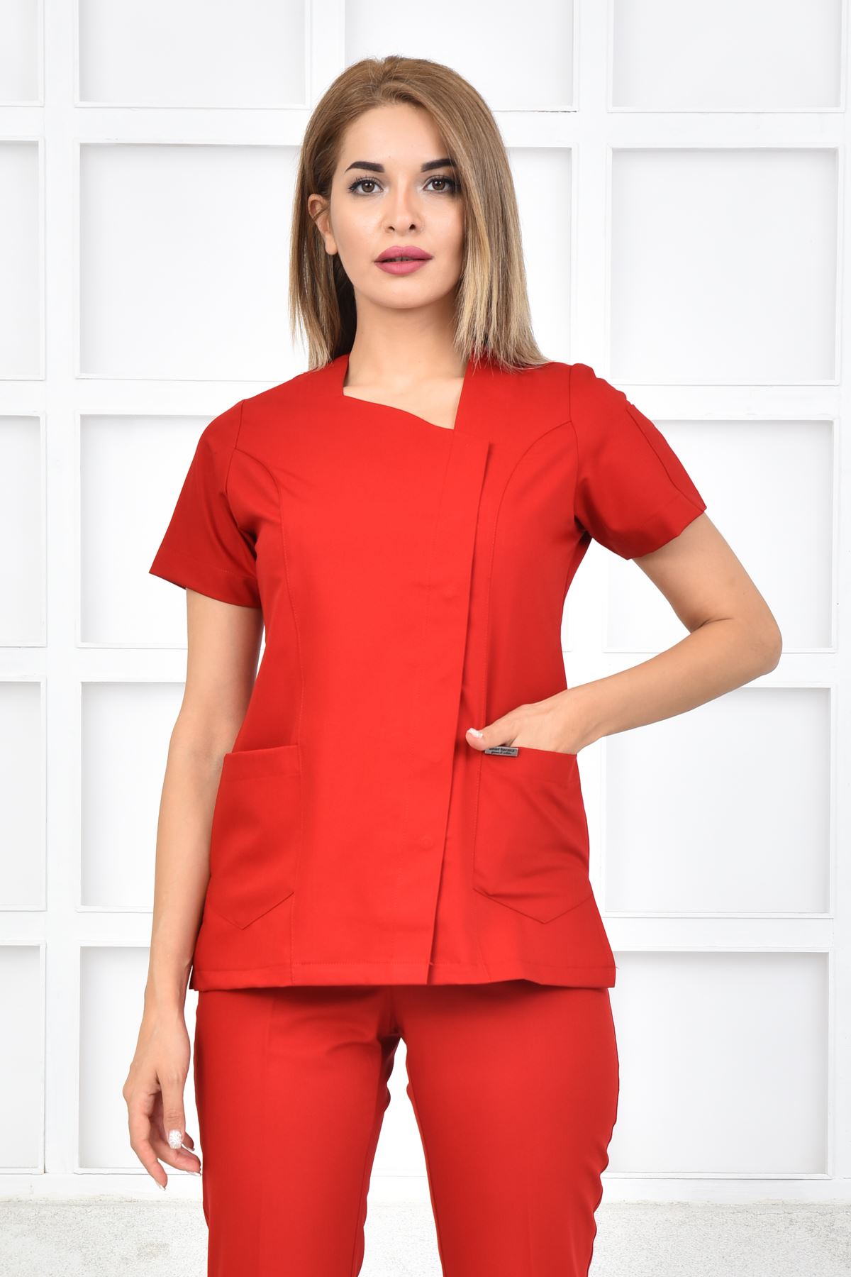 White kadın tesettür üst forma, sade tasarımı, pürüzsüz dokusu ve endüstriyel dayanıklılığı ile öne çıkar. Hassas ciltlere uygun kaygan yüzeyi uzun süreli kullanımda konfor sunar. Klinik, hastane ve muayenehane gibi tüm alanlarda tercih edilebilir.