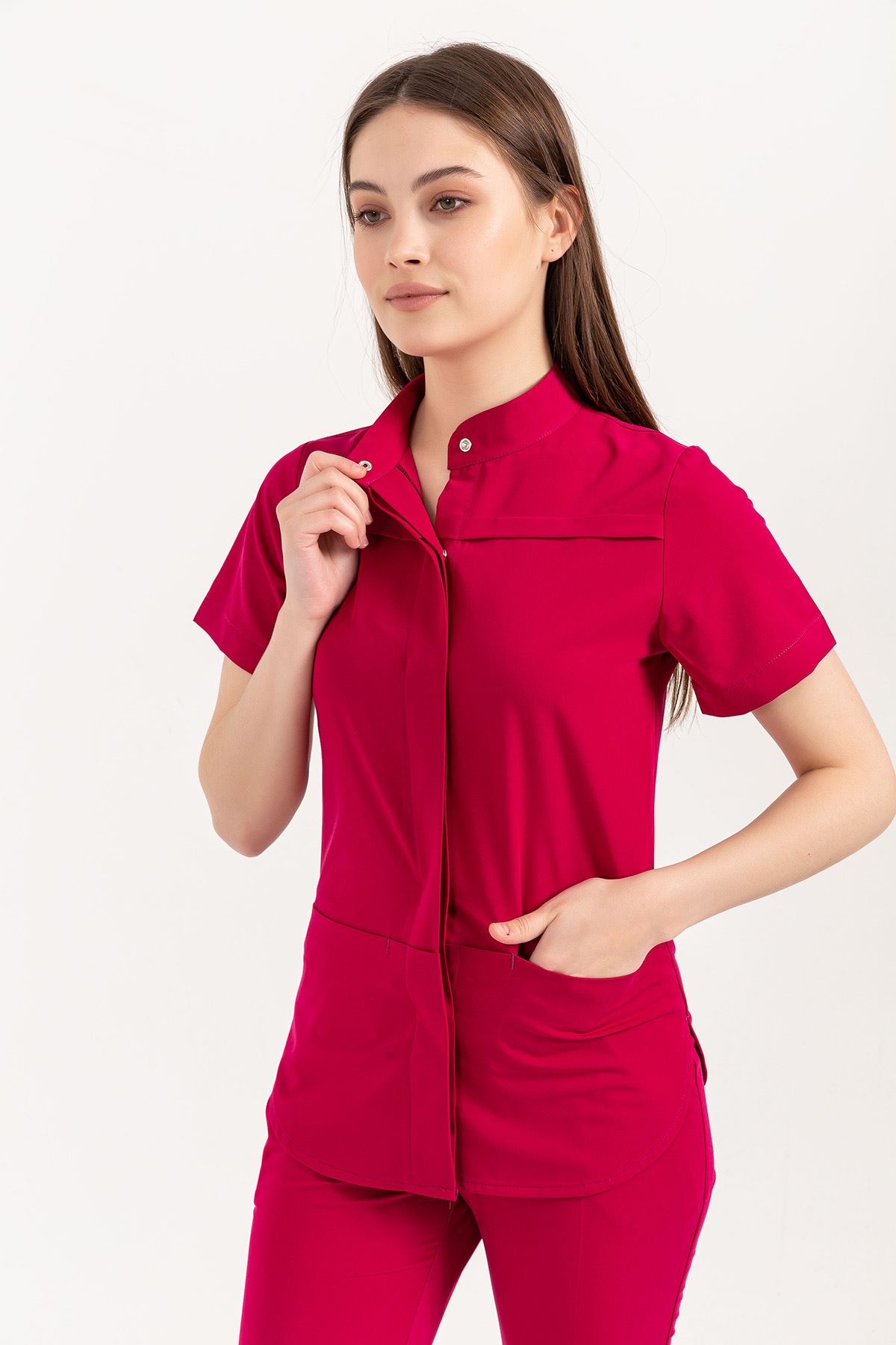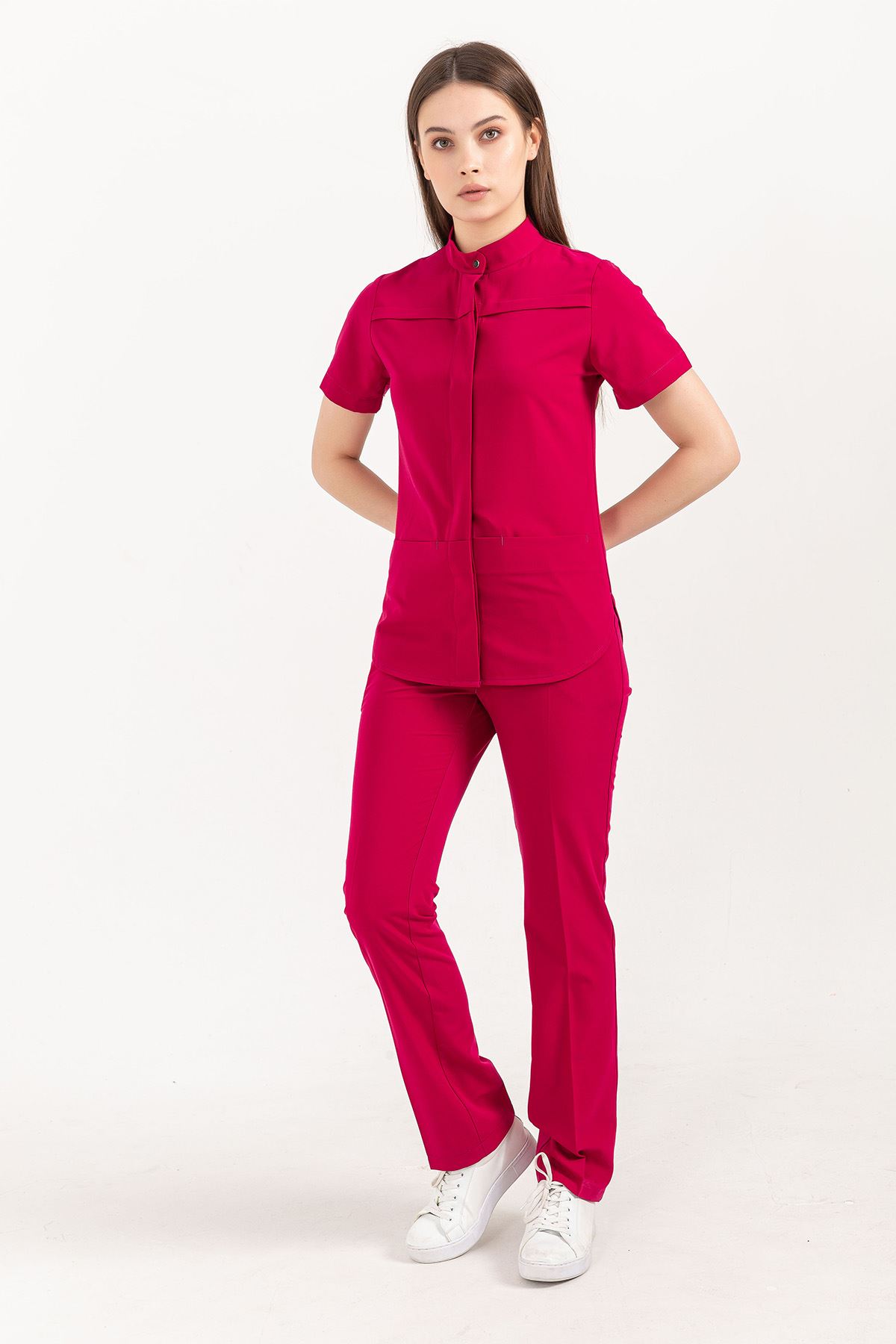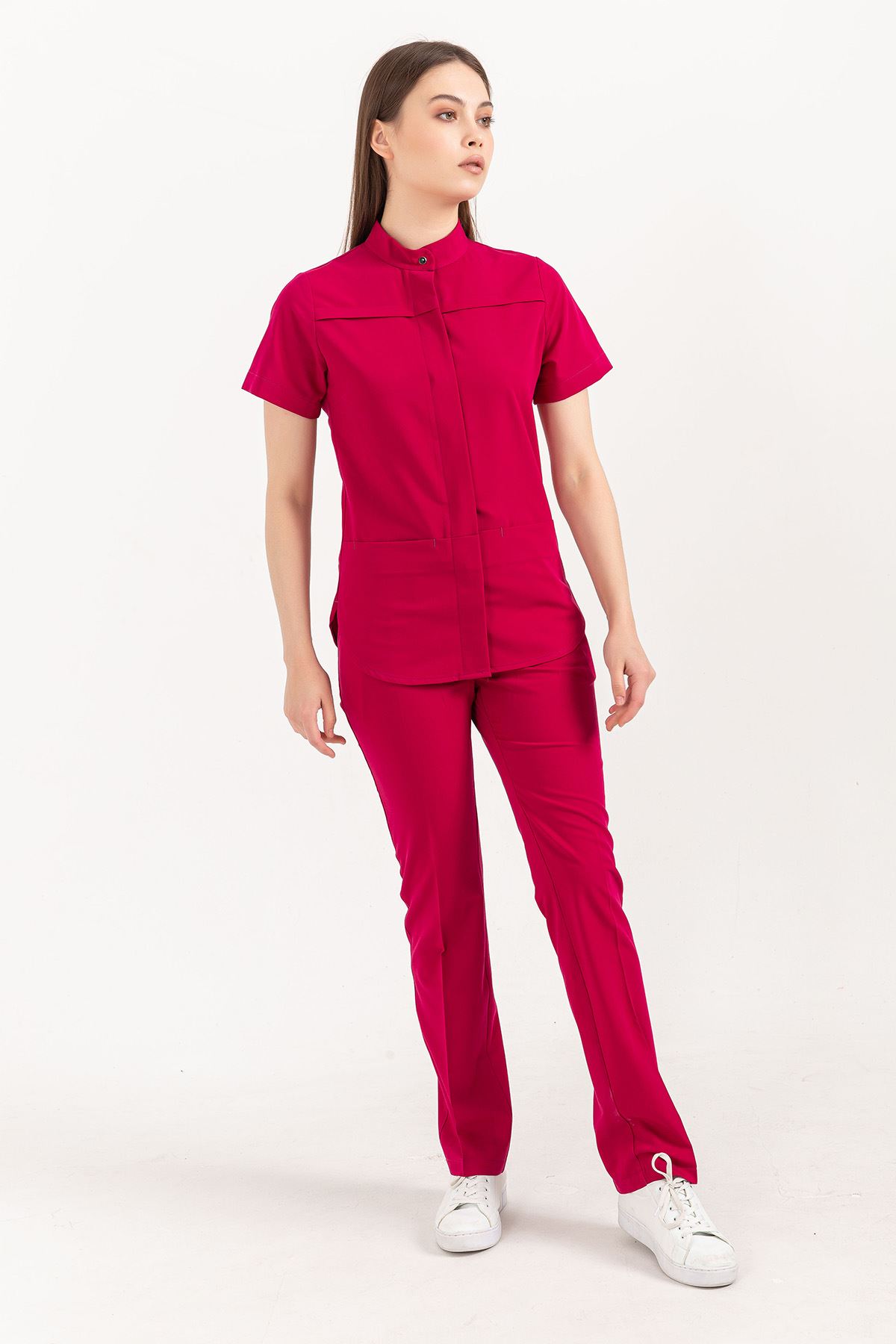 Collar Comfort Kadın Medikal Takım, likralı viskon karışımının esnek ve nefes alabilir yapısıyla gün boyu konfor sunar. Koyu fuşya rengi hijyenik ve düzenli bir görünümü destekler. Modern kesimi, kolay bakım avantajı ve ütü gerektirmeyen yapısıyla sağlık profesyonelleri için pratik bir tercihtir.