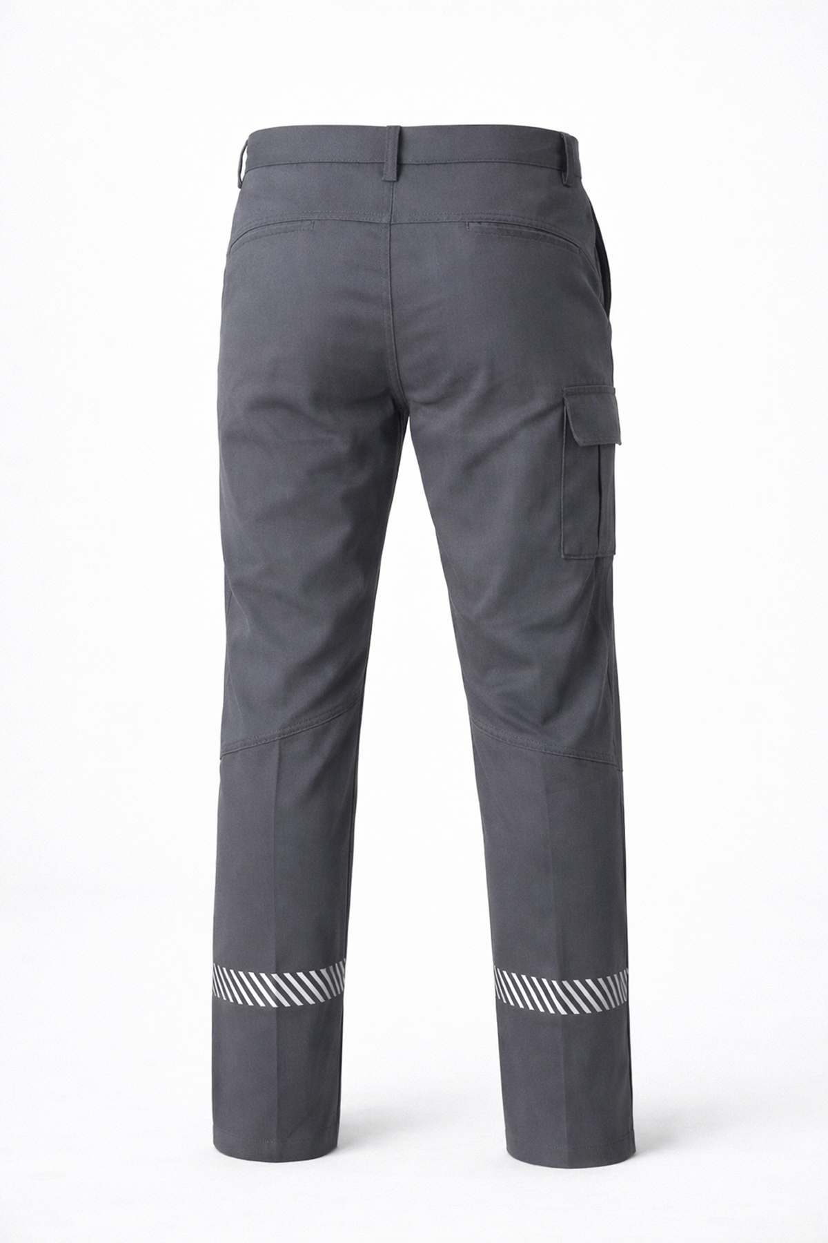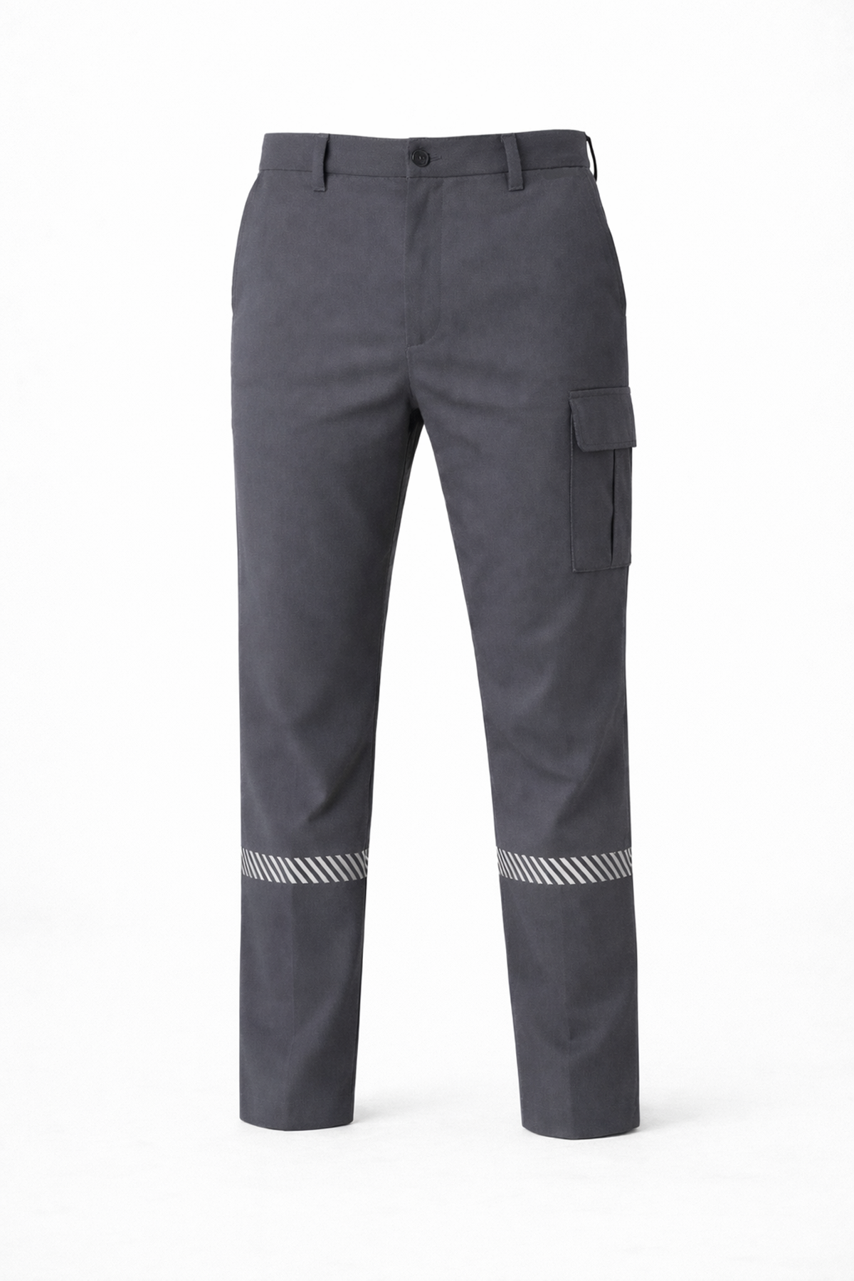 Diz altı ve paça kısmında yer alan reflektif çapraz şerit bantlar, görünürlüğü artırır ve pantolona teknik bir karakter kazandırır. Kumaşın yarı mat yüzeyi, kırışmaya karşı dirençli yapısı ve tok duruşu sayesinde hem çalışma alanlarında hem de günlük kullanımda rahatlıkla tercih edilebilir.