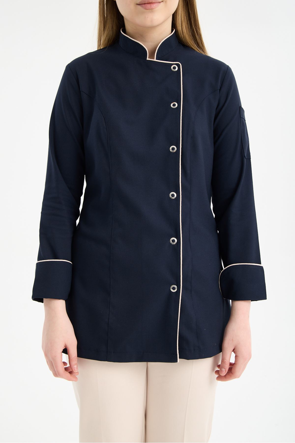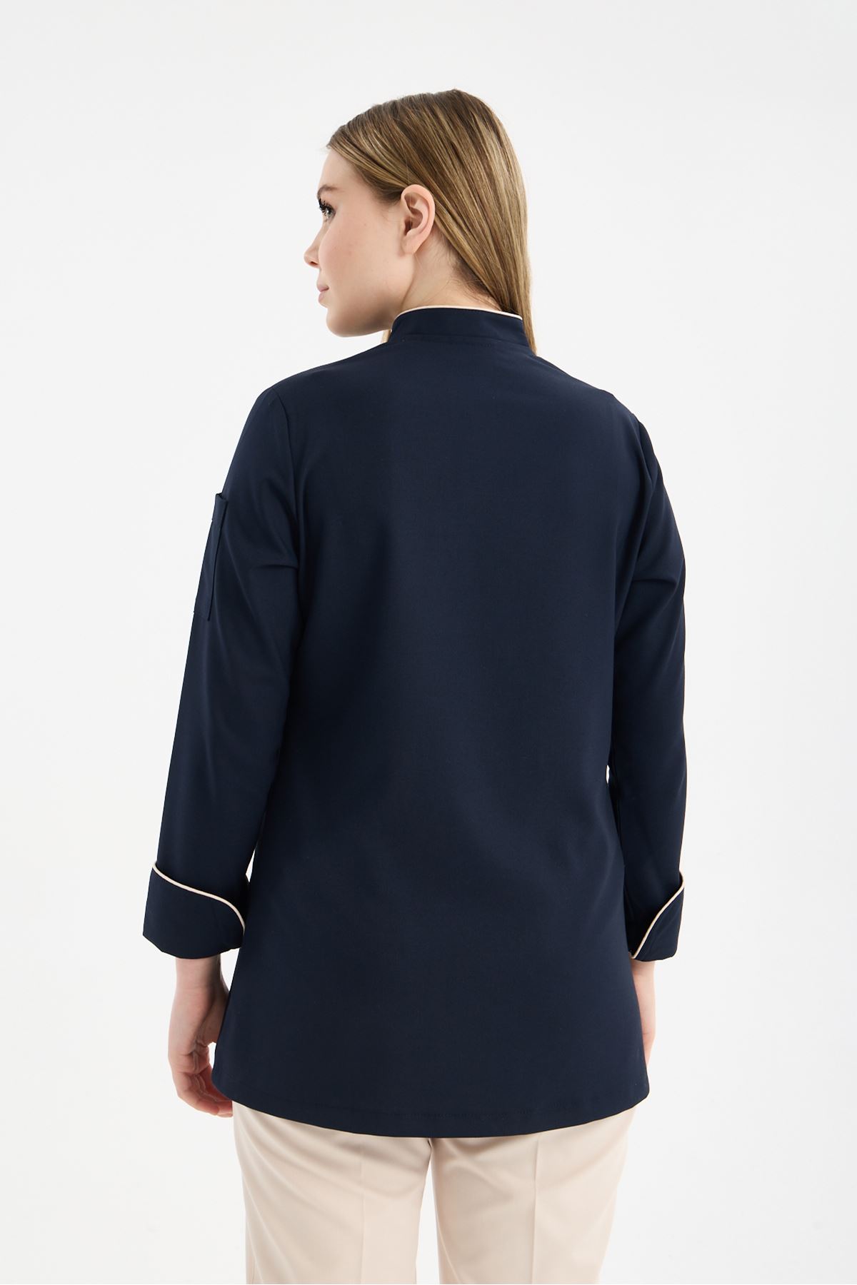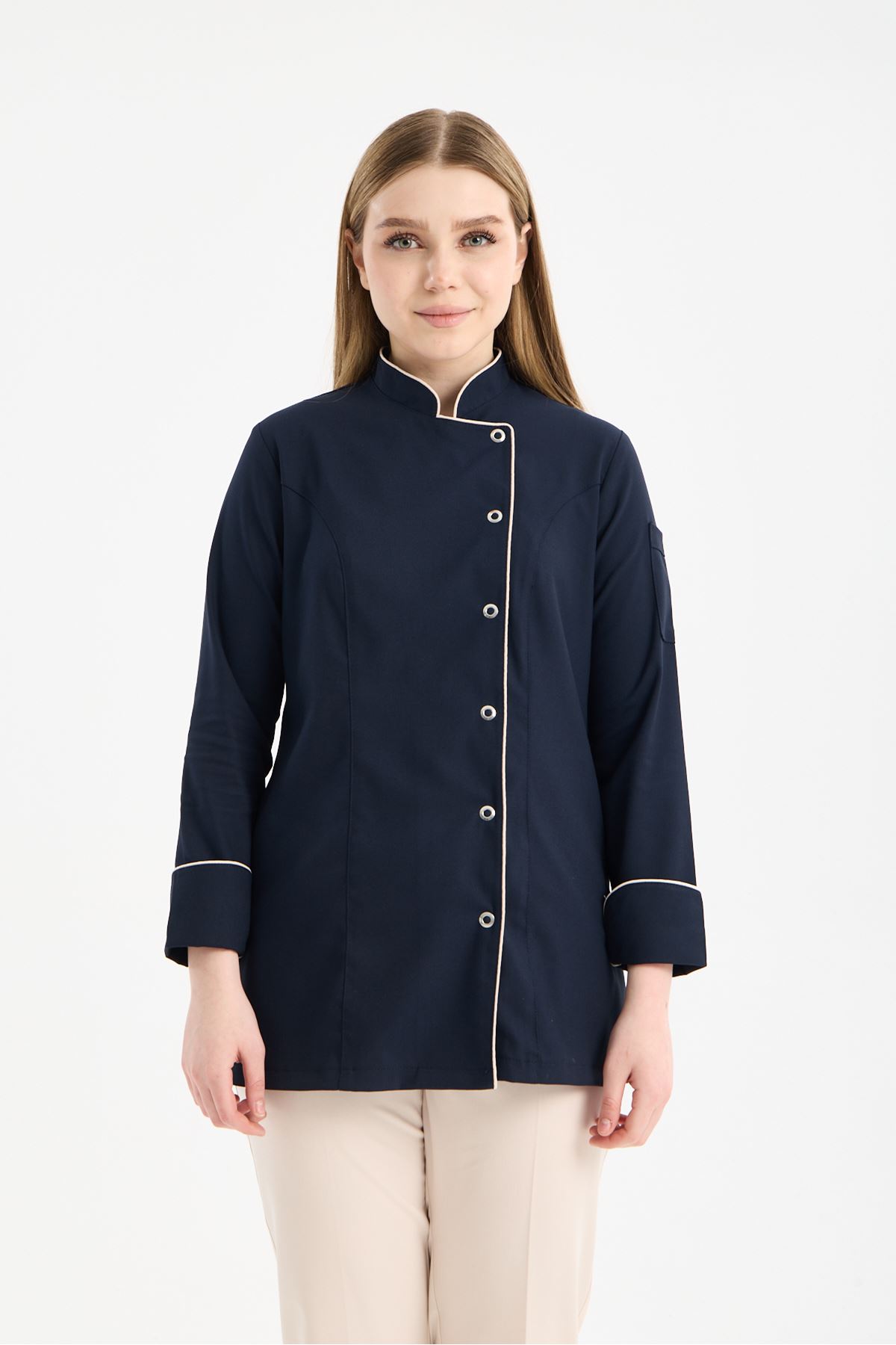 Kadın Chef Üniforma Tek Üst Lacivert Beyaz Biyeli