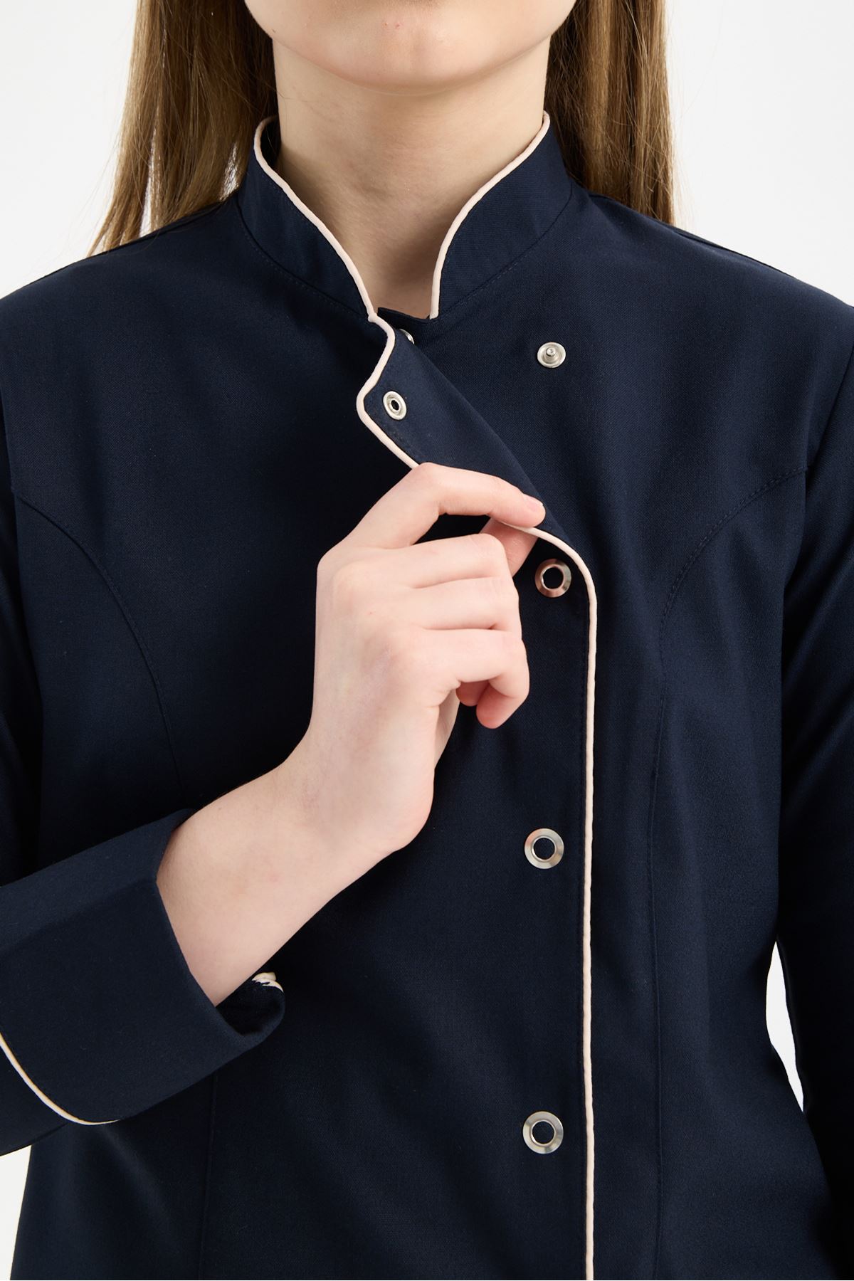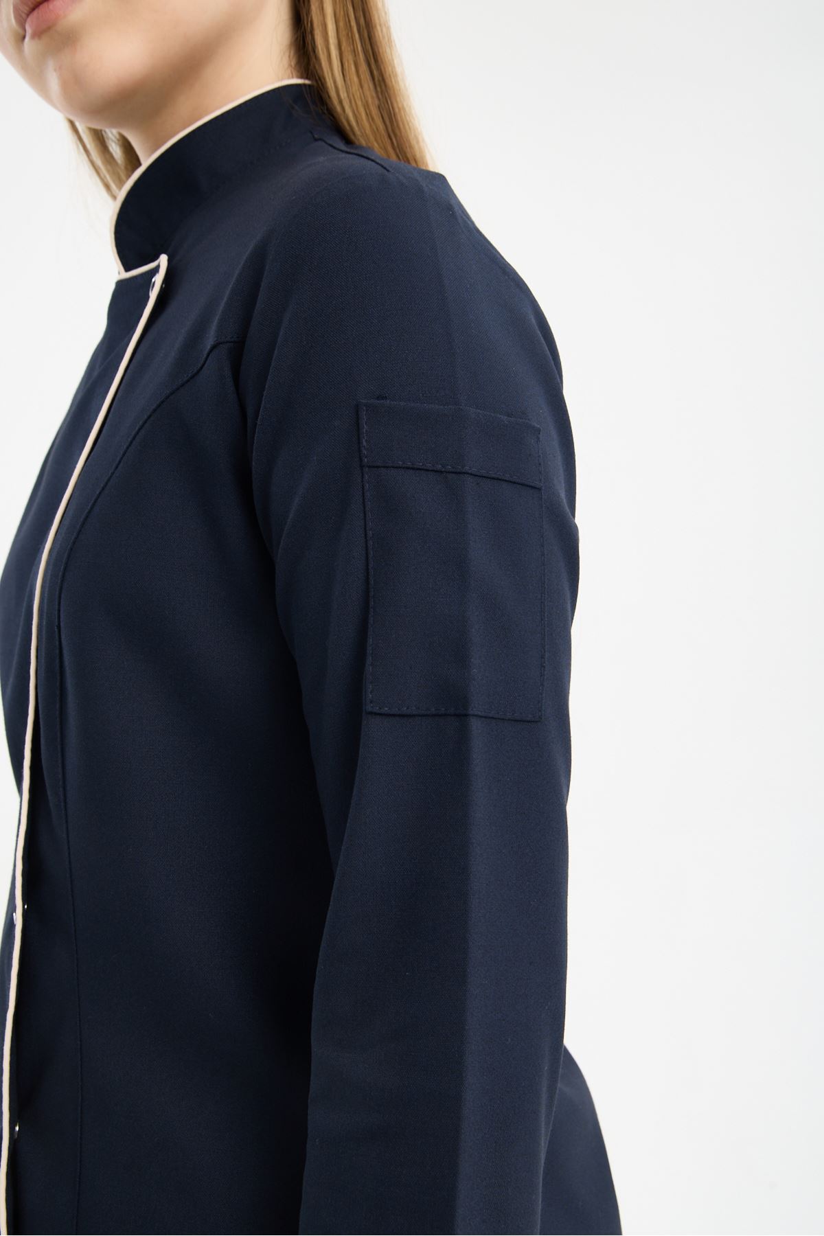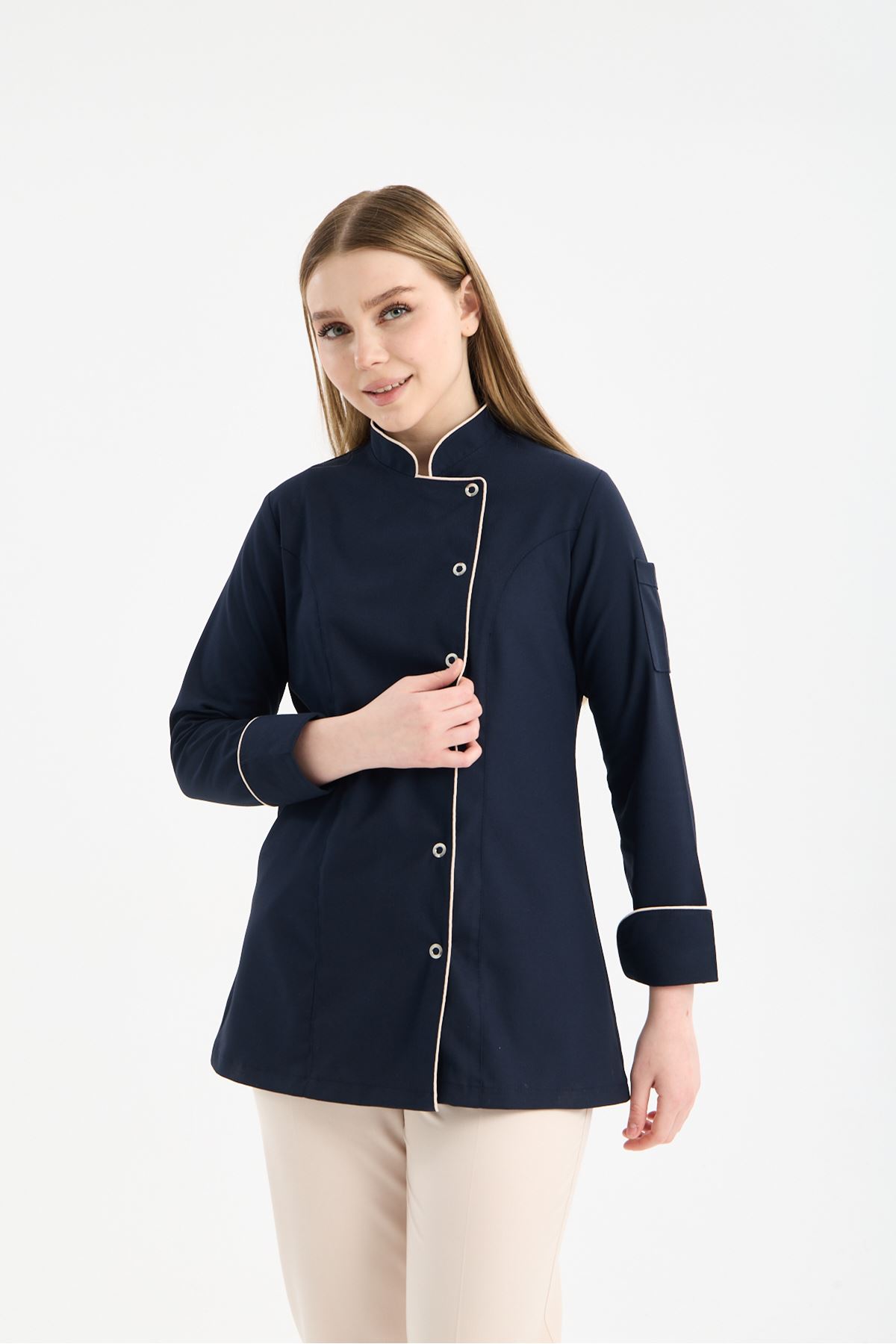 Kadın Chef Üniforma Tek Üst Lacivert Beyaz Biyeli