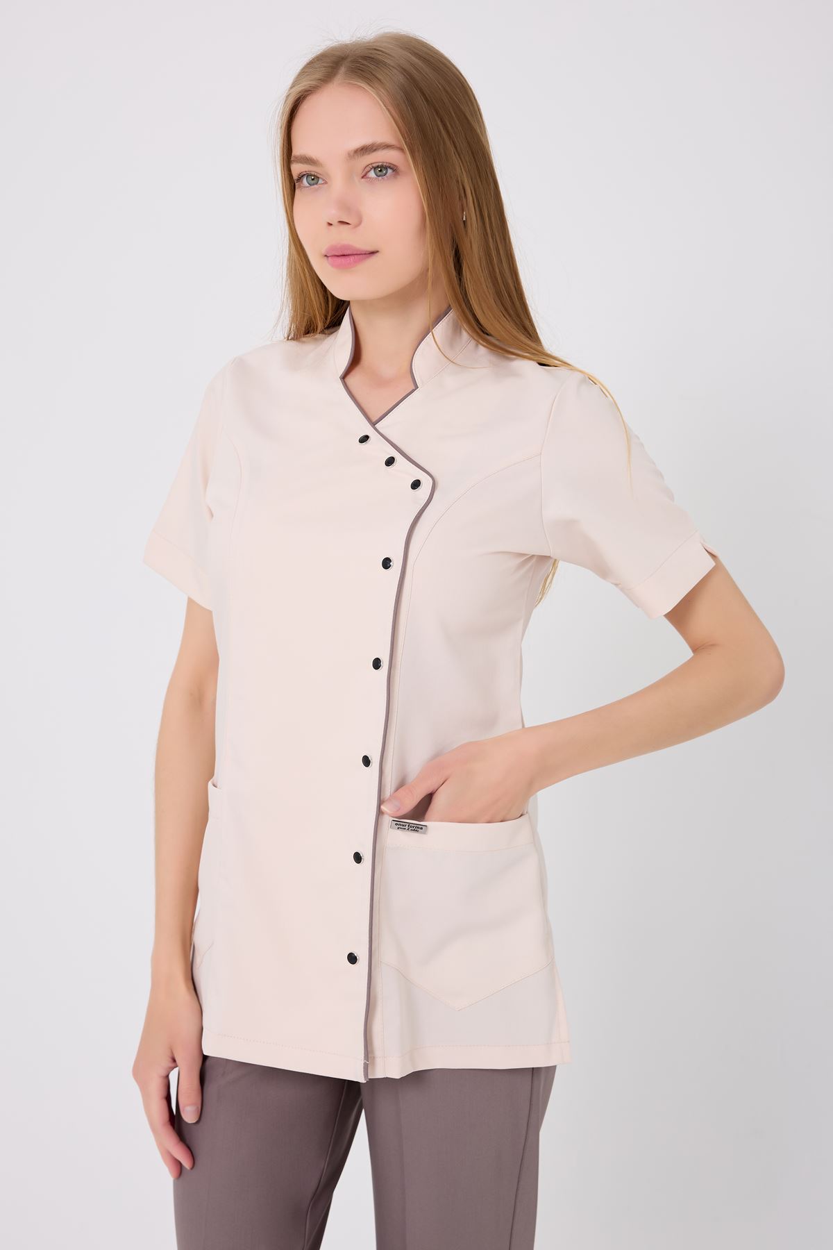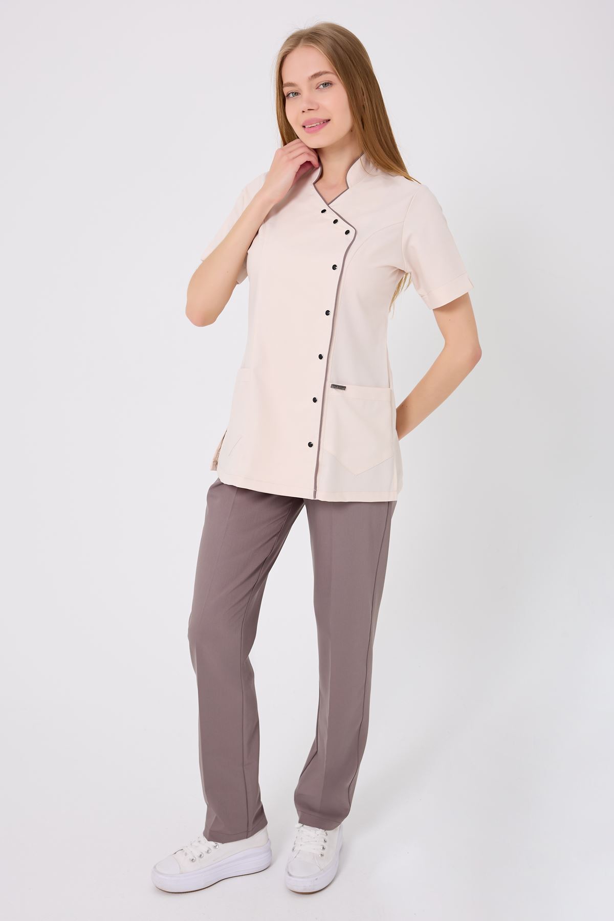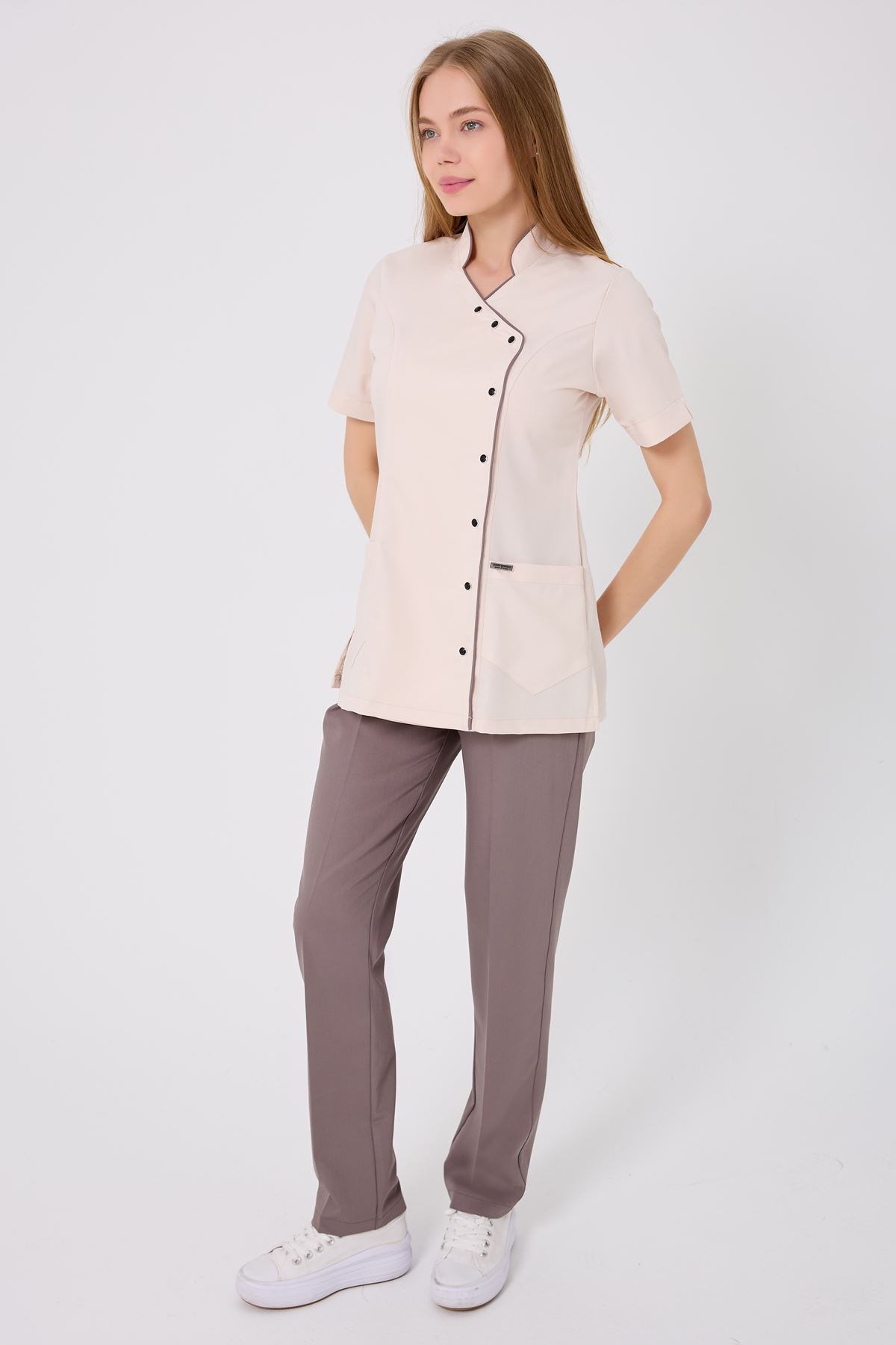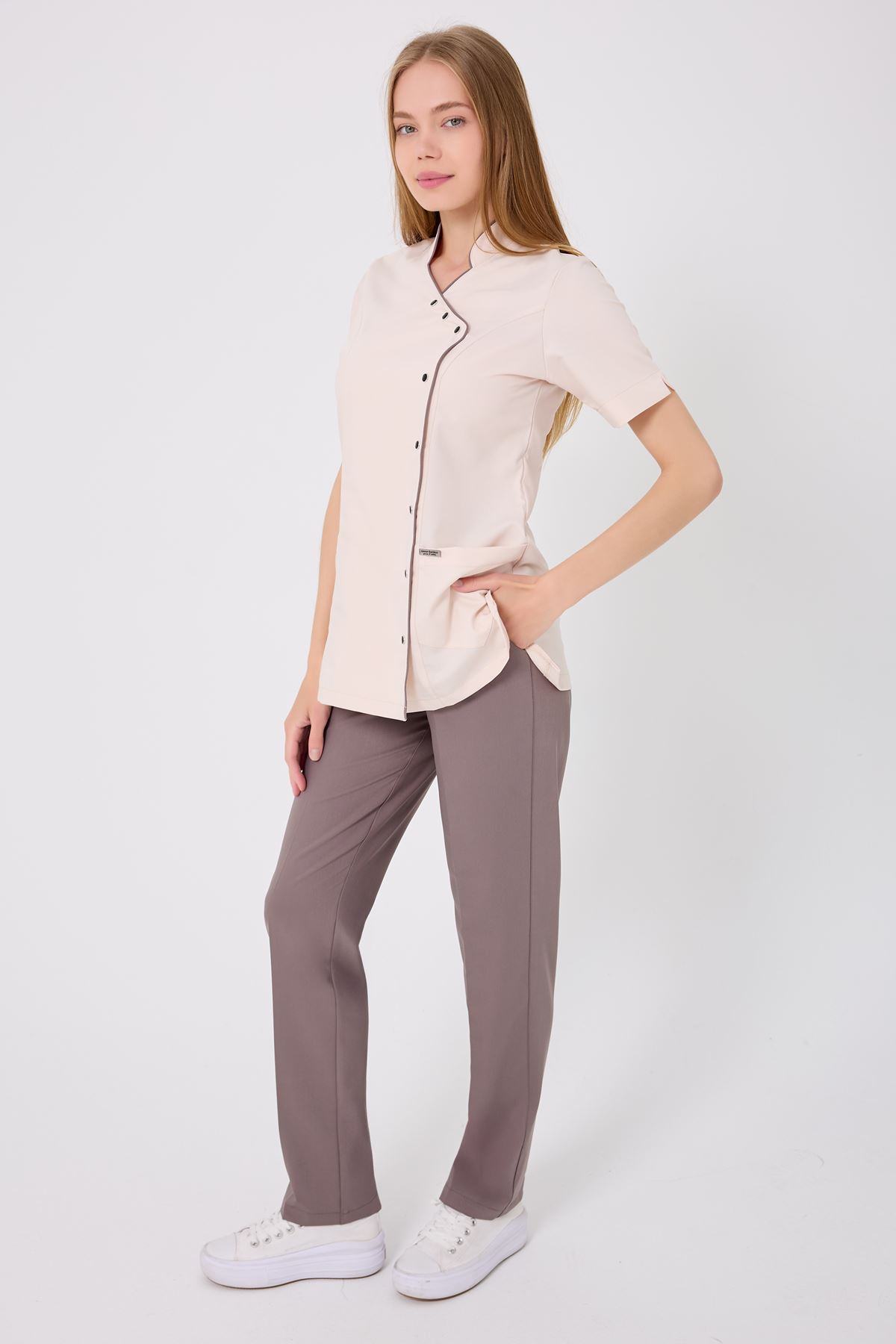 Kravaze Koyu Bej Biyeli Koyu Bej Pantolonlu Kadın Takım; sade tasarımı, rahat kalıbı ve zarif biyeli detaylarıyla profesyonel şıklığı destekler. Endüstriyel yıkamalara dayanıklıdır ve formunu uzun süre korur. Kliniklerden muayenehanelere kadar her medikal ortamda güvenle tercih edilebilecek modern ve konforlu bir seçenektir.