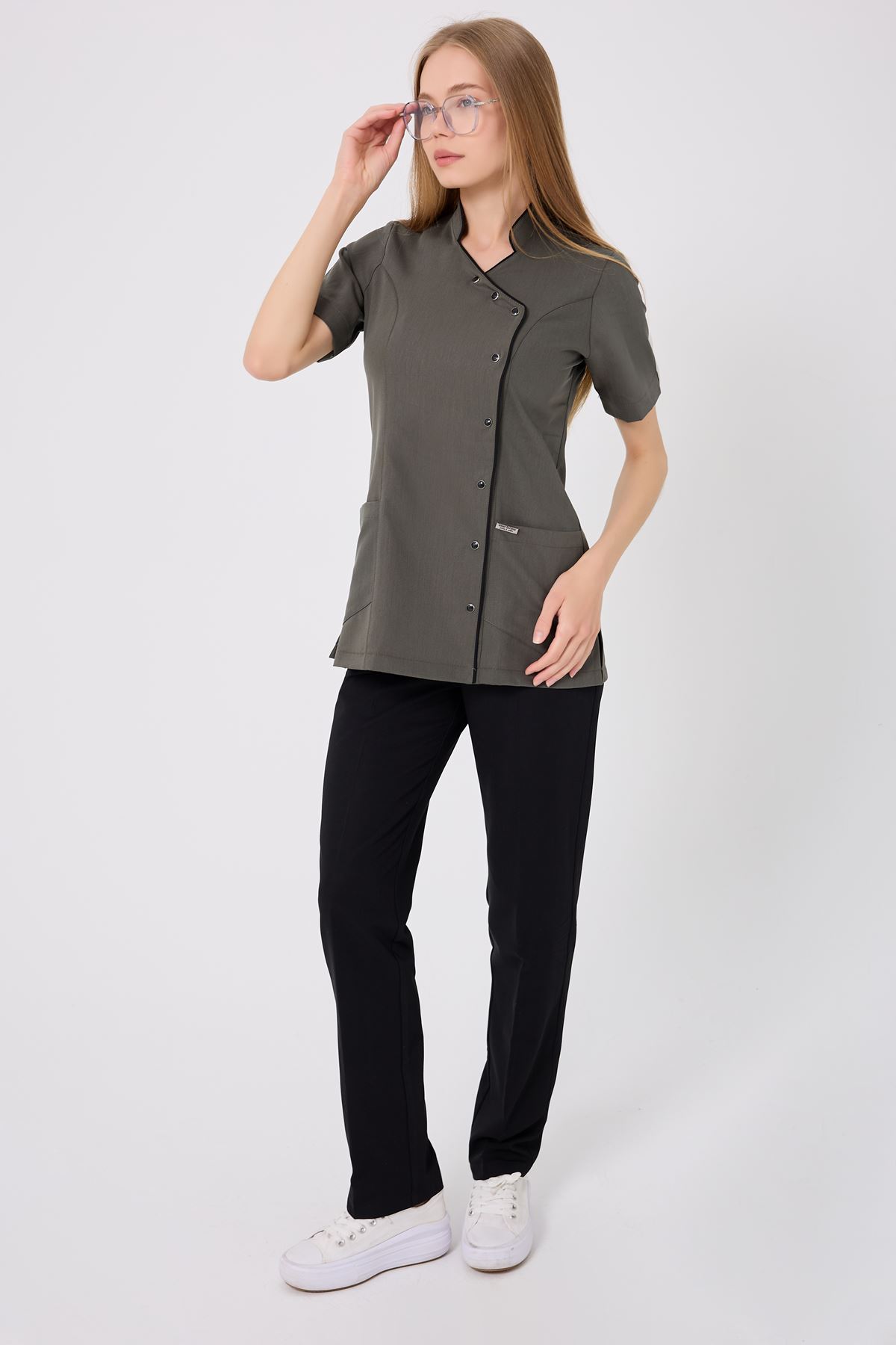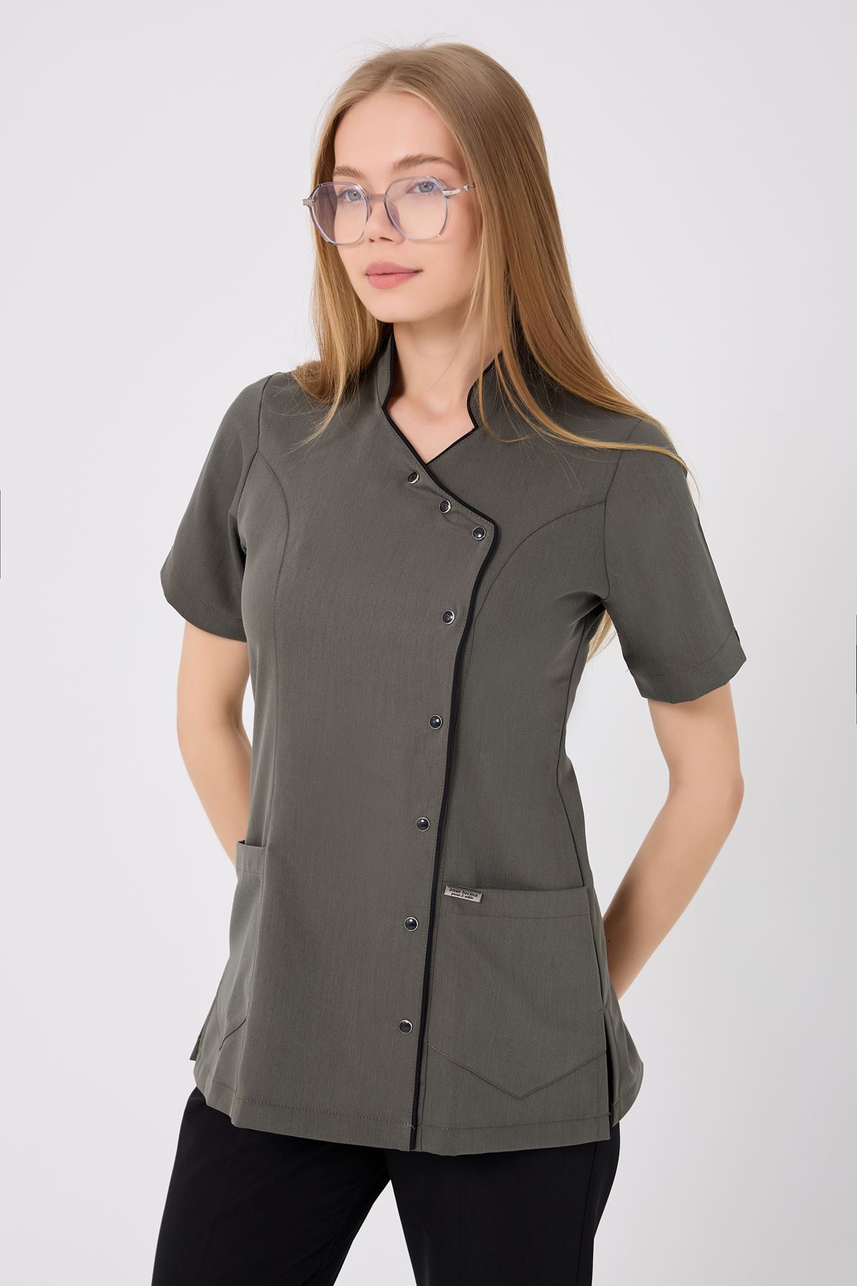 Haki rengin doğal tonunu siyah biyeler modern bir kontrastla tamamlar. Esnek kumaş gün boyu rahat hareket etmeyi sağlar. Kırışmaz yapısı ütü ihtiyacını azaltır, yoğun iş temposunda bakım kolaylığı sunar. Fonksiyonel cepler, ihtiyaç duyulan eşyaları taşımak için pratiklik sağlar.