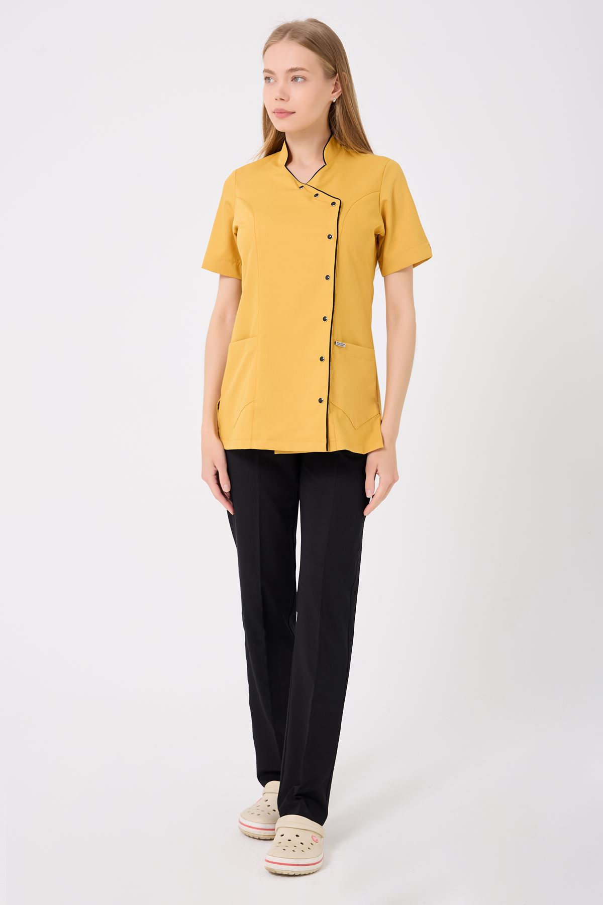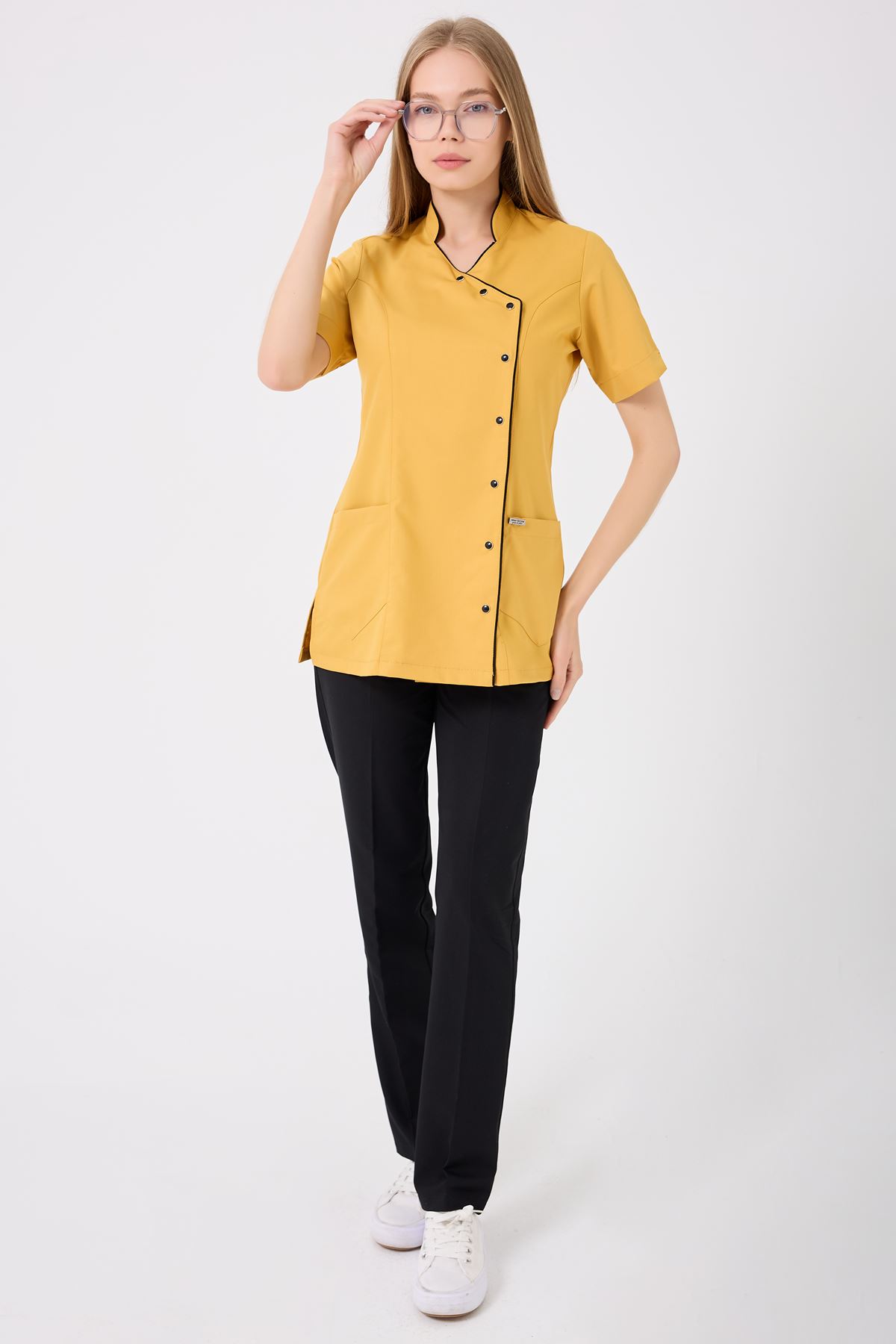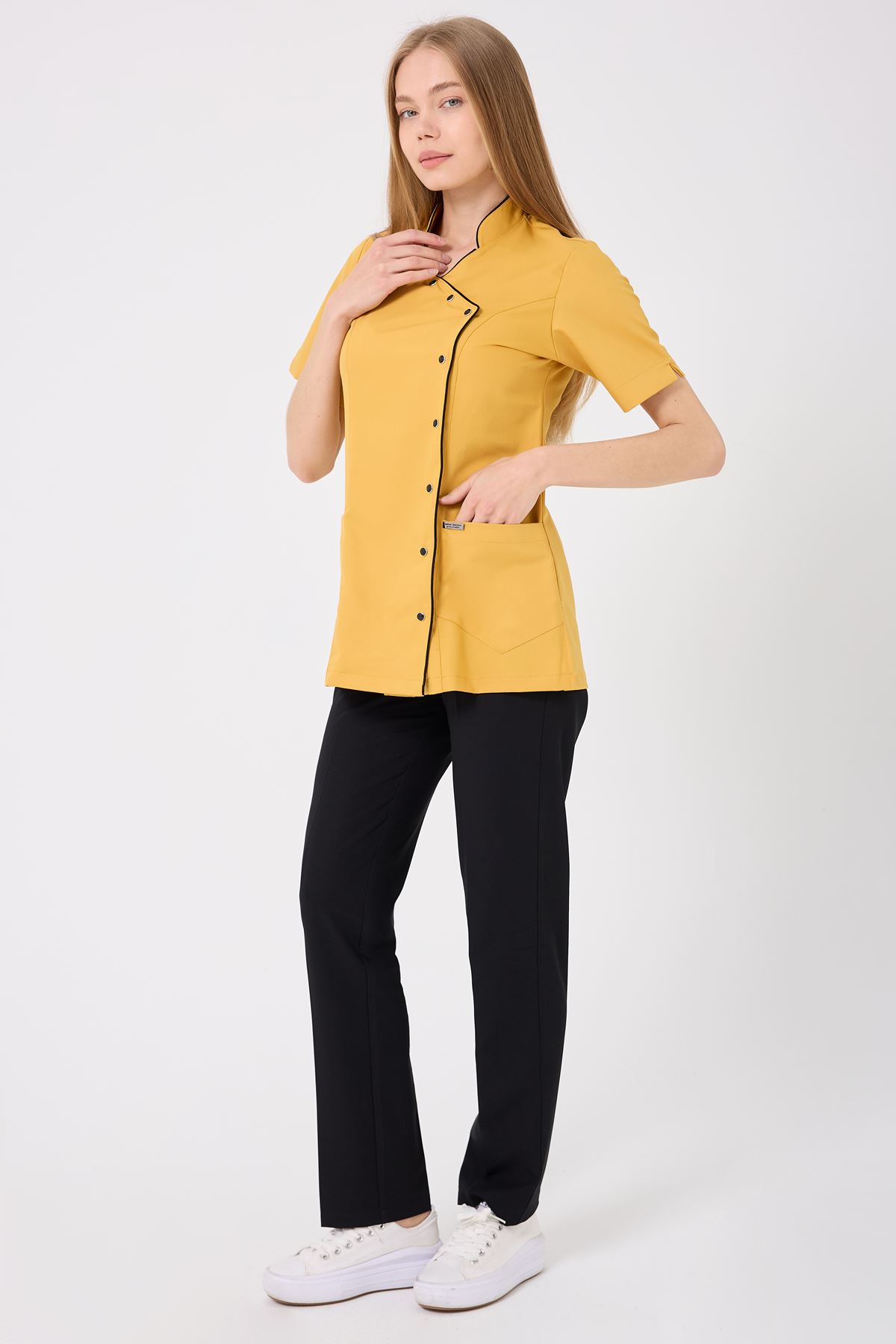 Siyah biyeler, hardal rengin sıcak tonuna güçlü bir kontrast kazandırarak modern bir duruş oluşturur. Kumaş kırışmaz yapısıyla ütü ihtiyacını azaltır ve formunu korur. Hafif ve esnek yapısı uzun vardiyalarda konfor sağlar. Pratik cepler günlük kullanımda işlevsellik sunar.