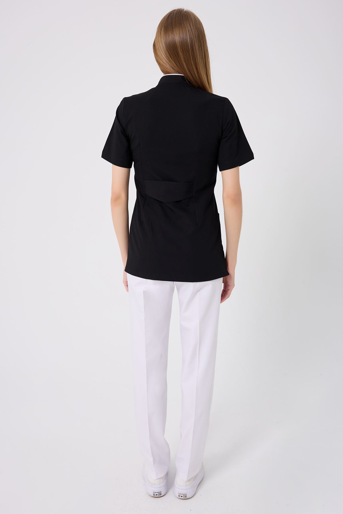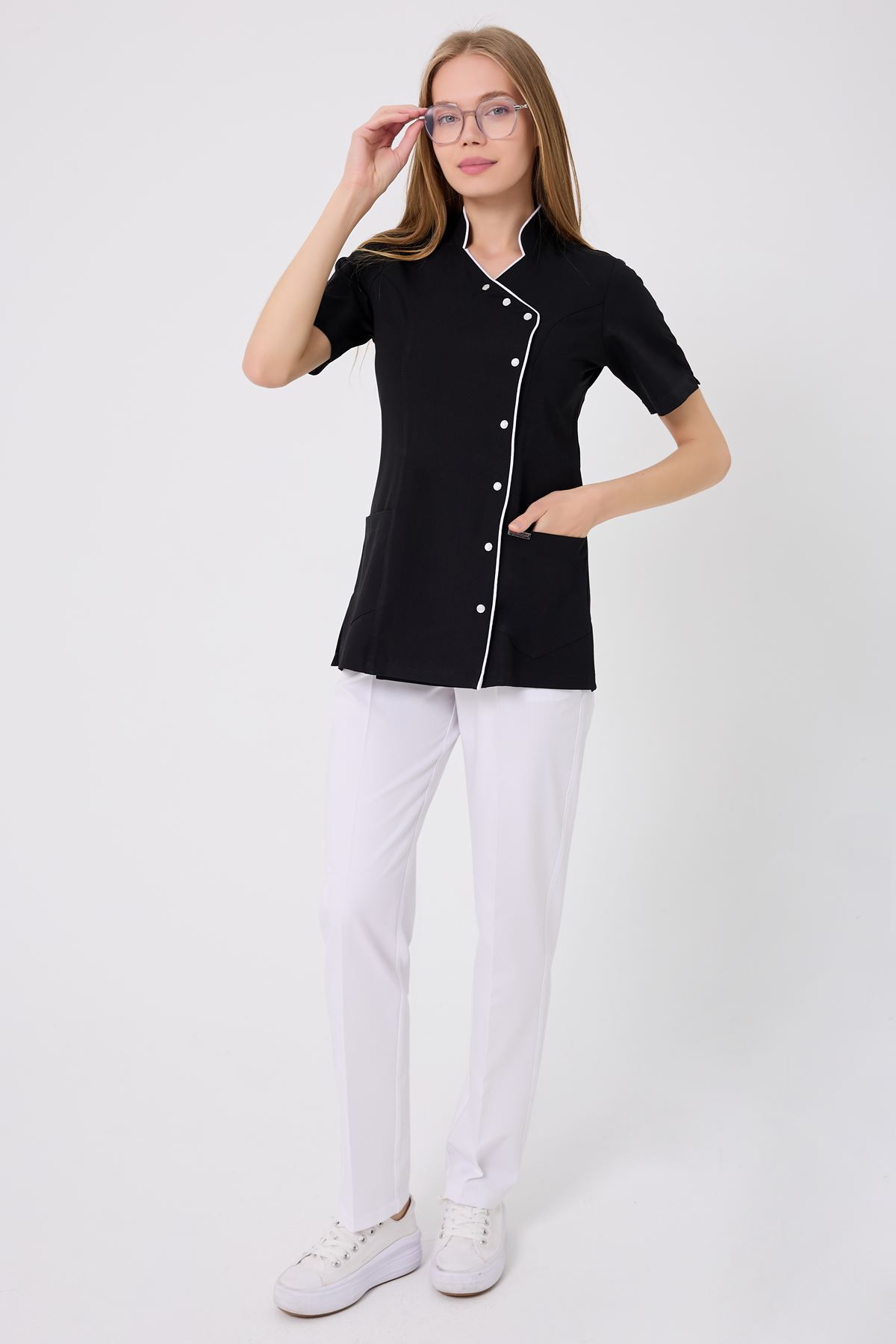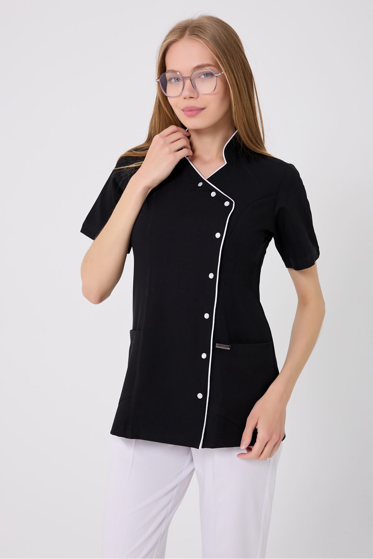 Beyaz biyeler, siyah rengin resmiyetini modern bir kontrastla öne çıkarır. Kravaze yaka, hareket kolaylığı sağlarken formu korur. Ütü gerektirmeyen kırışmaz kumaş, uzun saatler boyunca ilk günkü görünümünü korur. Kullanışlı cepler, gün içinde kolayca erişmeniz gereken eşyalar için idealdir.