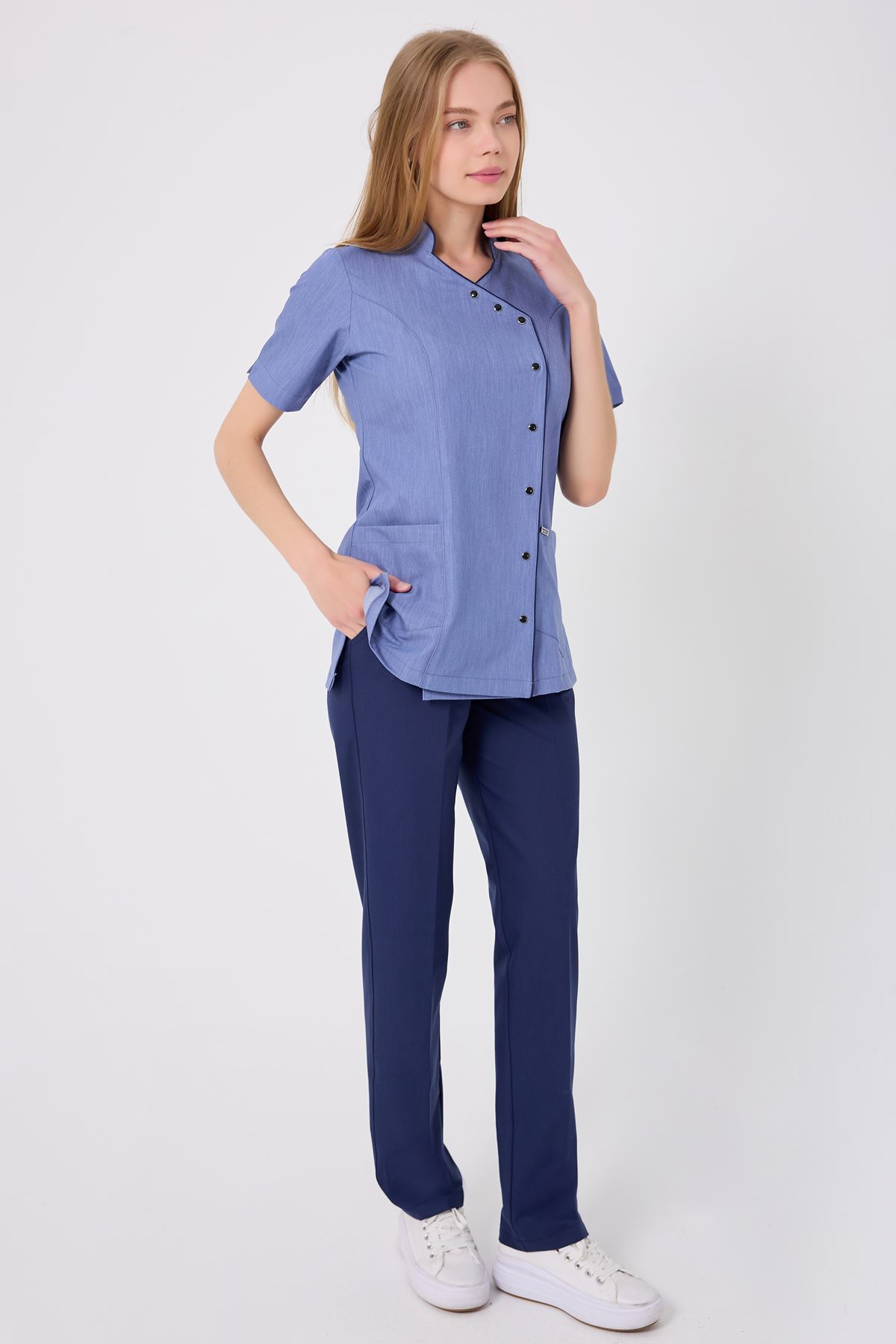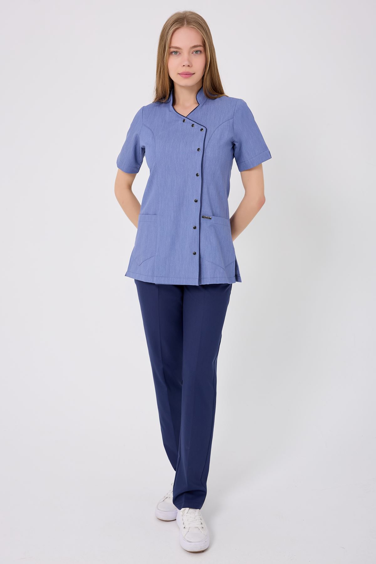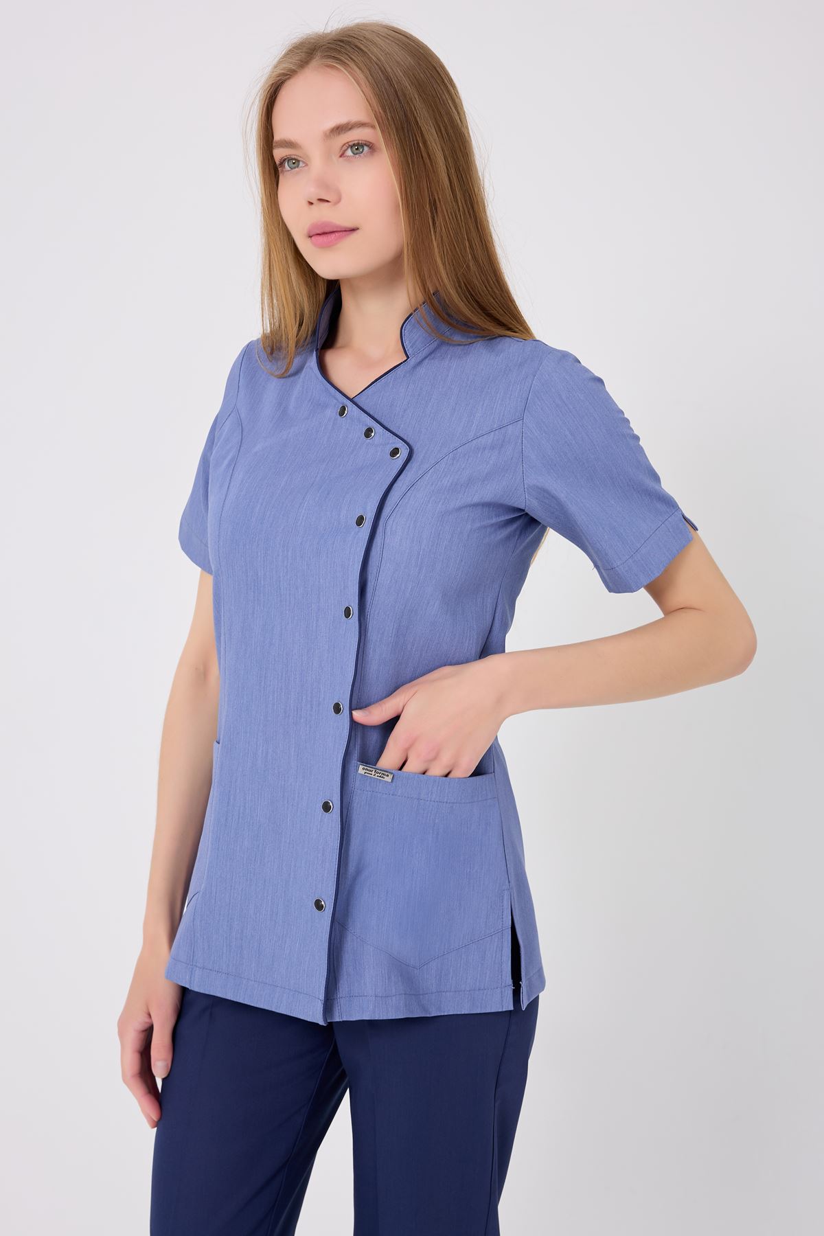 İndigo biyeler, tensel kot kumaşla modern bir uyum yakalayarak kombini özel kılar. Kırışmaz kumaş bakım kolaylığı sağlar, esnek yapı uzun vardiyalarda hareket özgürlüğü sunar. Doğal tensel dokusu cildi tahriş etmez ve ferah kullanım imkânı sunar. Cepler, işlevsellik için ideal saklama alanı oluşturur.