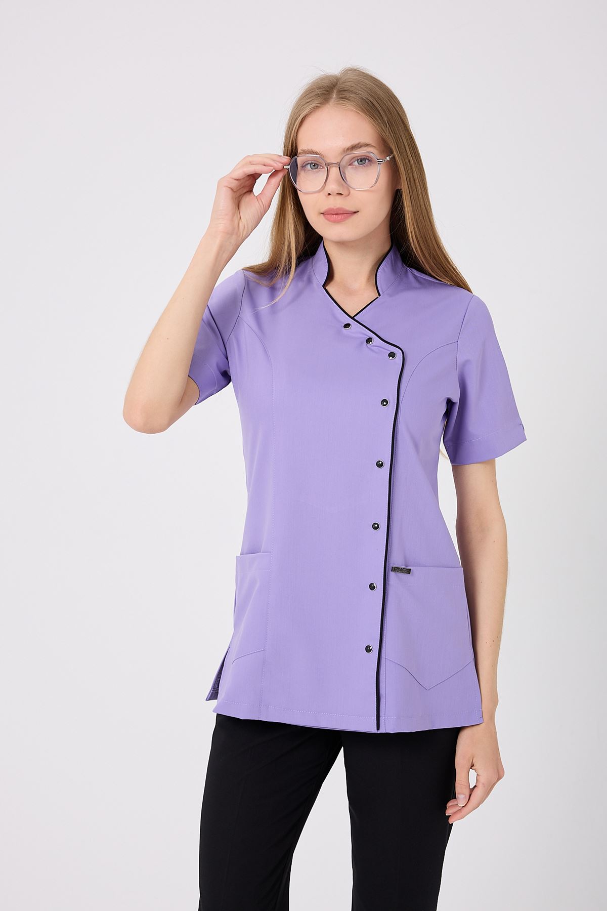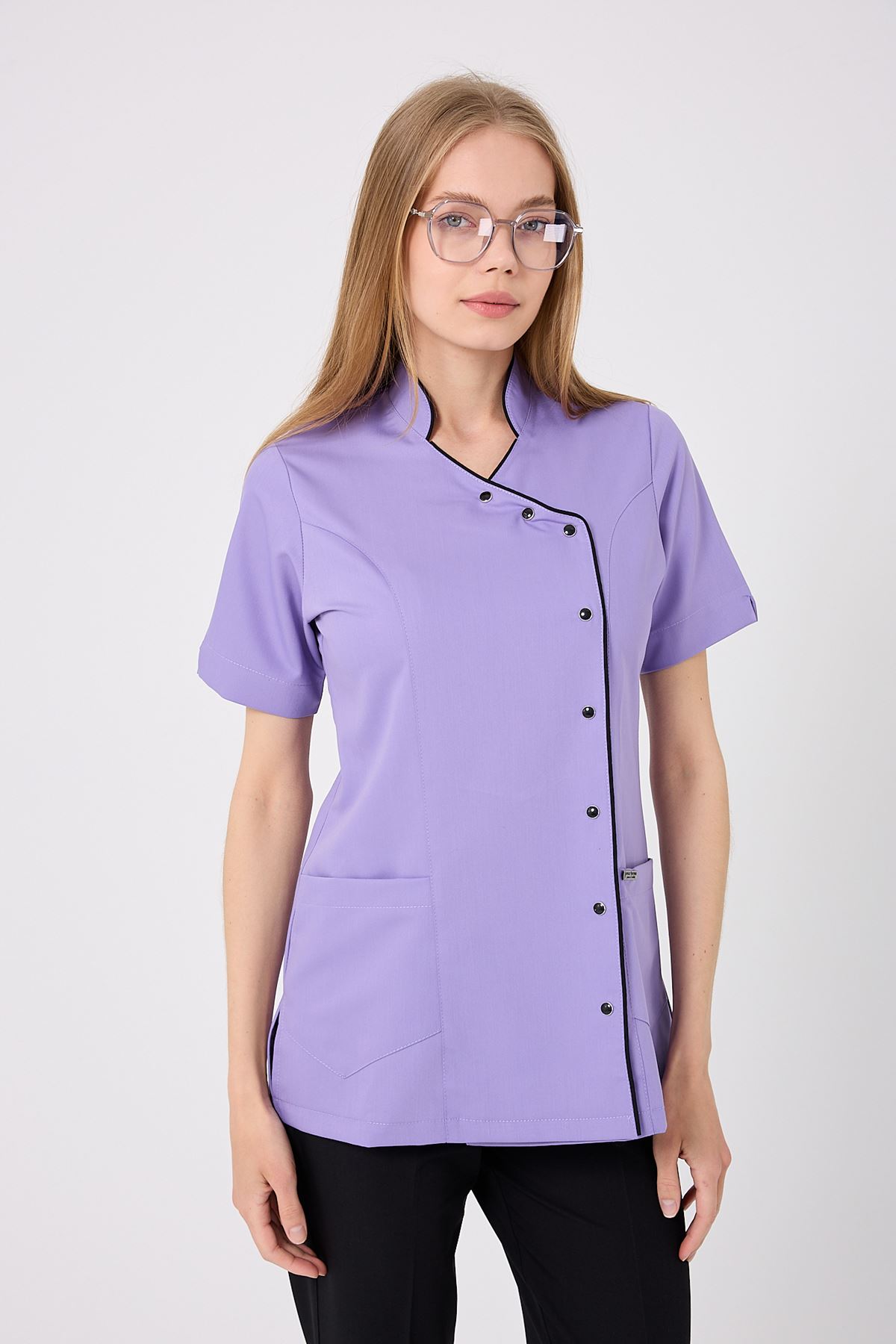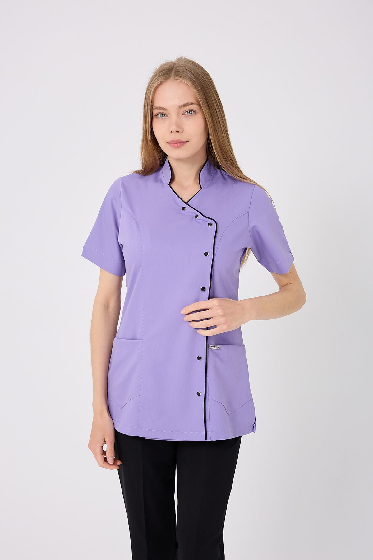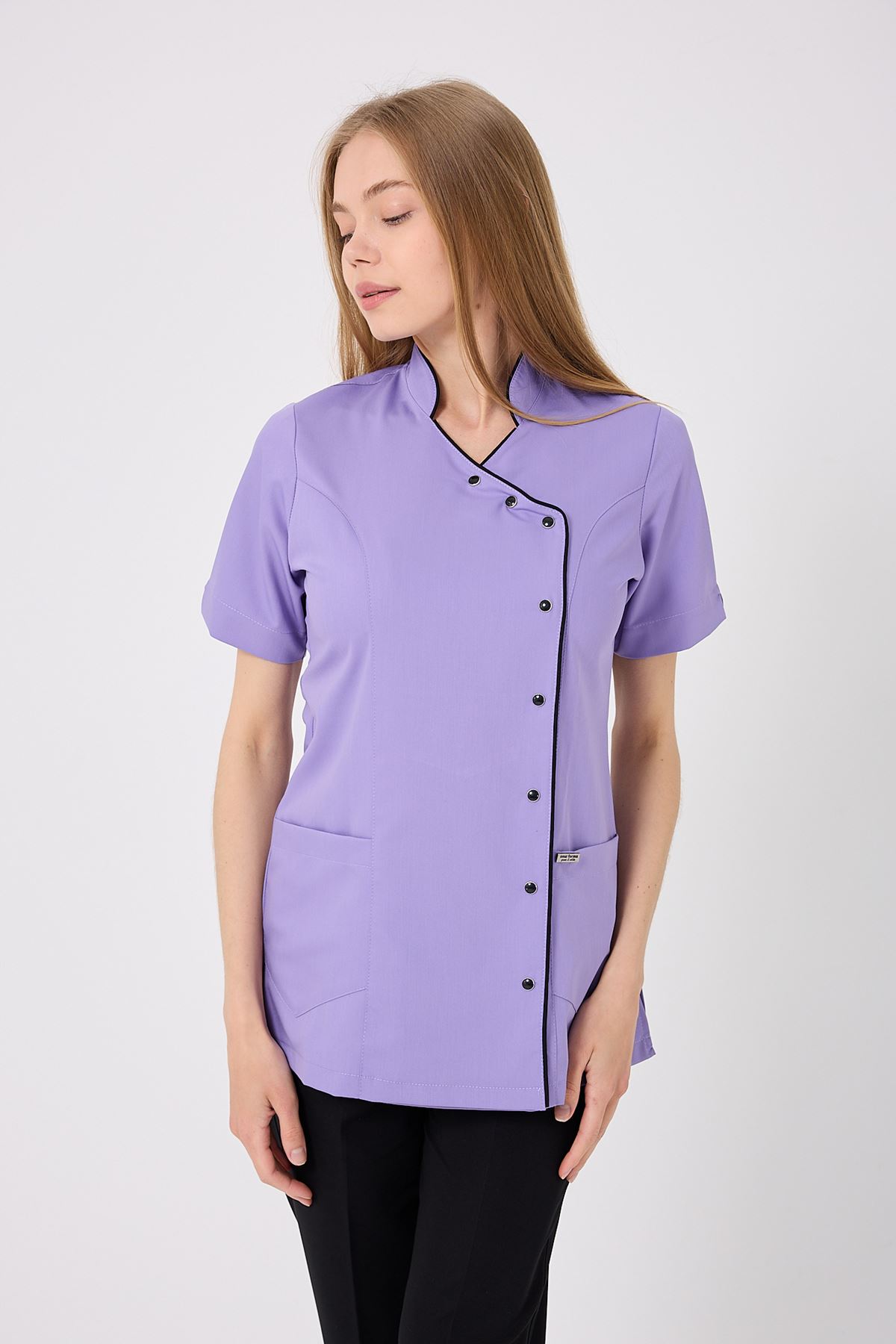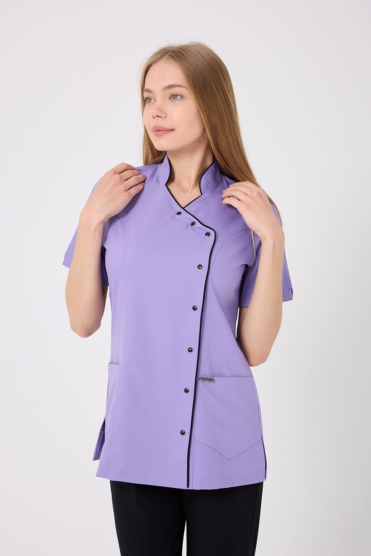 Kravaze Siyah Biyeli Kadın Üst Lila; özgün renk uyumu, şık biyeli tasarımı ve dayanıklı kumaşıyla profesyonel bir duruş sergiler. Klinik, hastane ve yoğun iş ortamlarında düzenli bir görünüm sağlar. Endüstriyel yıkamalara dayanıklı kumaşı sayesinde formunu uzun süre korur, şıklık ve konforu bir arada sunar.