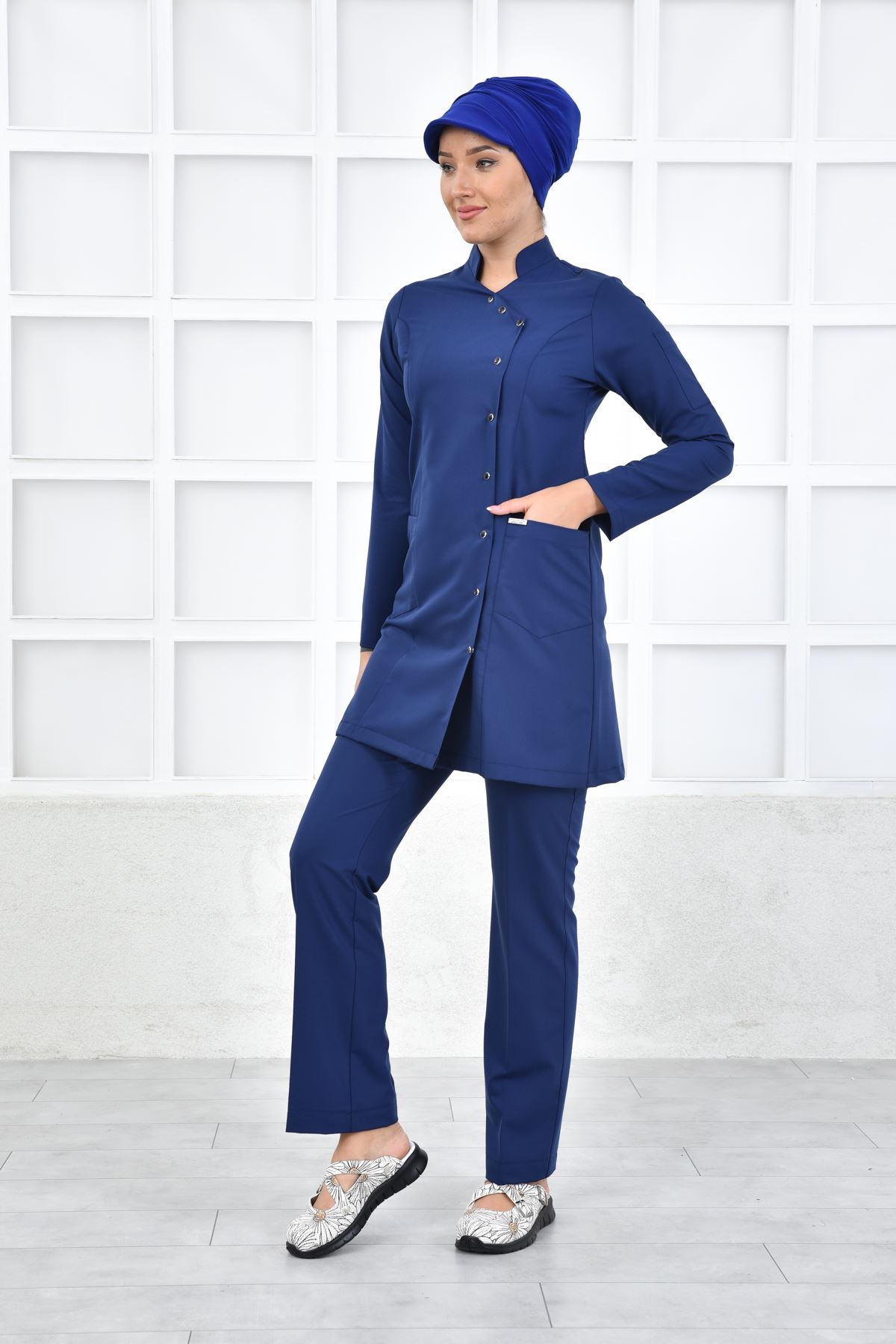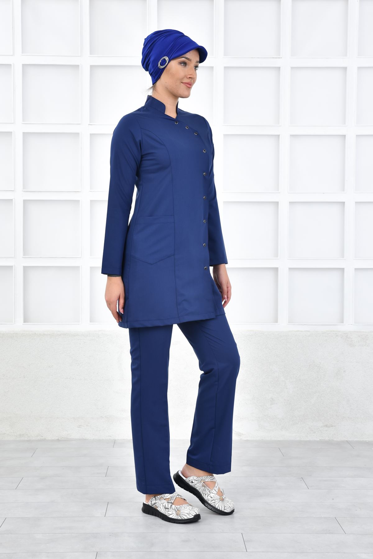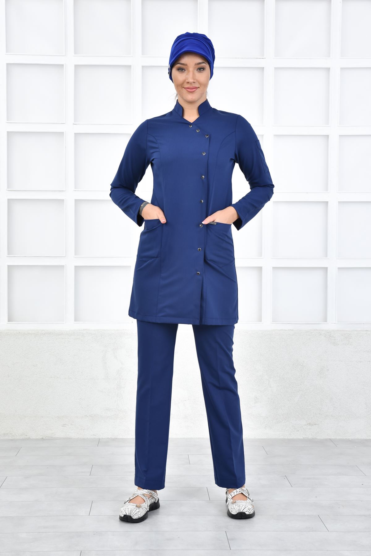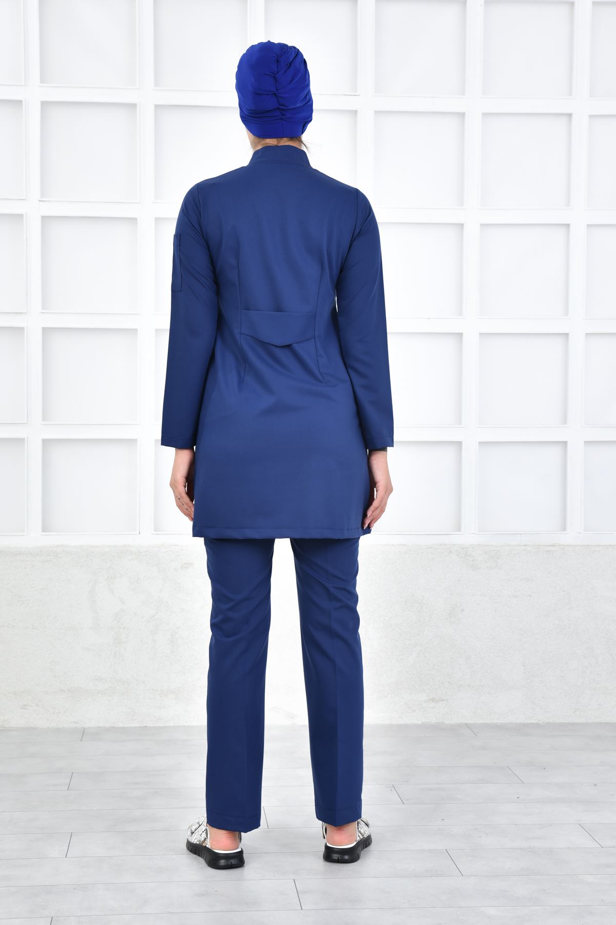 İndigo rengi sofistike bir profesyonellik hissi yaratır. Nefes alabilir kumaşı, yoğun tempoda terlemeyi azaltır. Uzun kalıbı tesettür uyumuna uygundur. Kırışmaz dokusu ütü gereksinimini minimuma indirir.