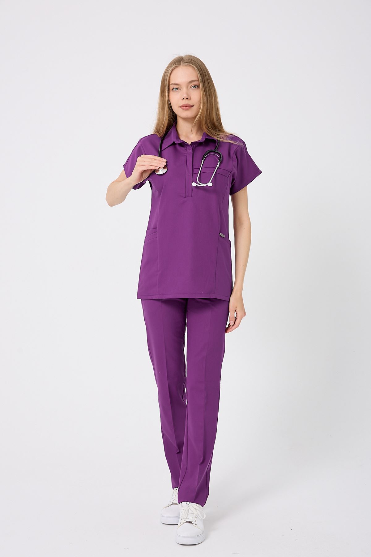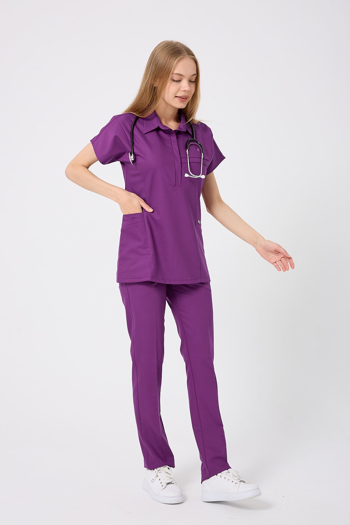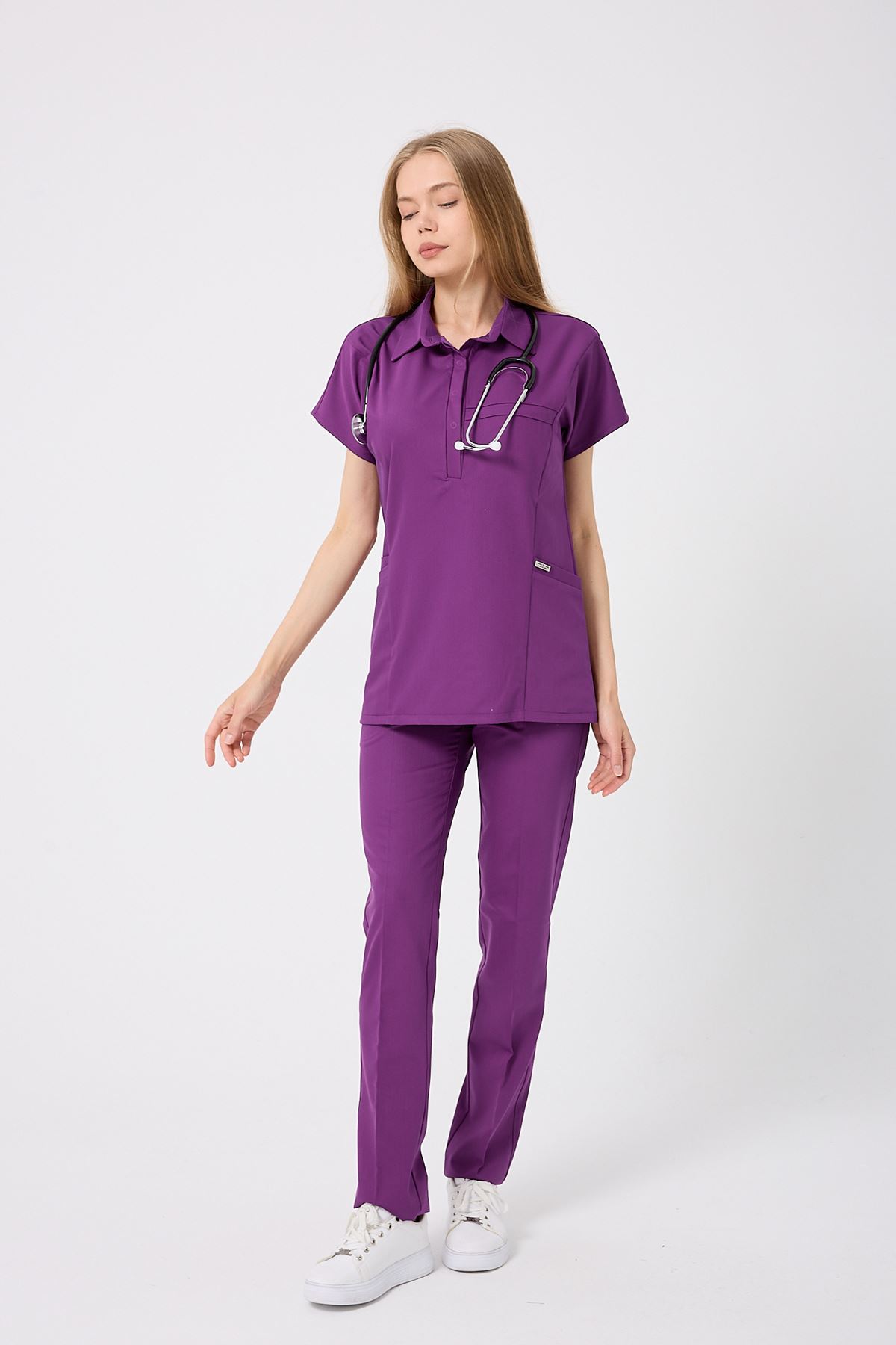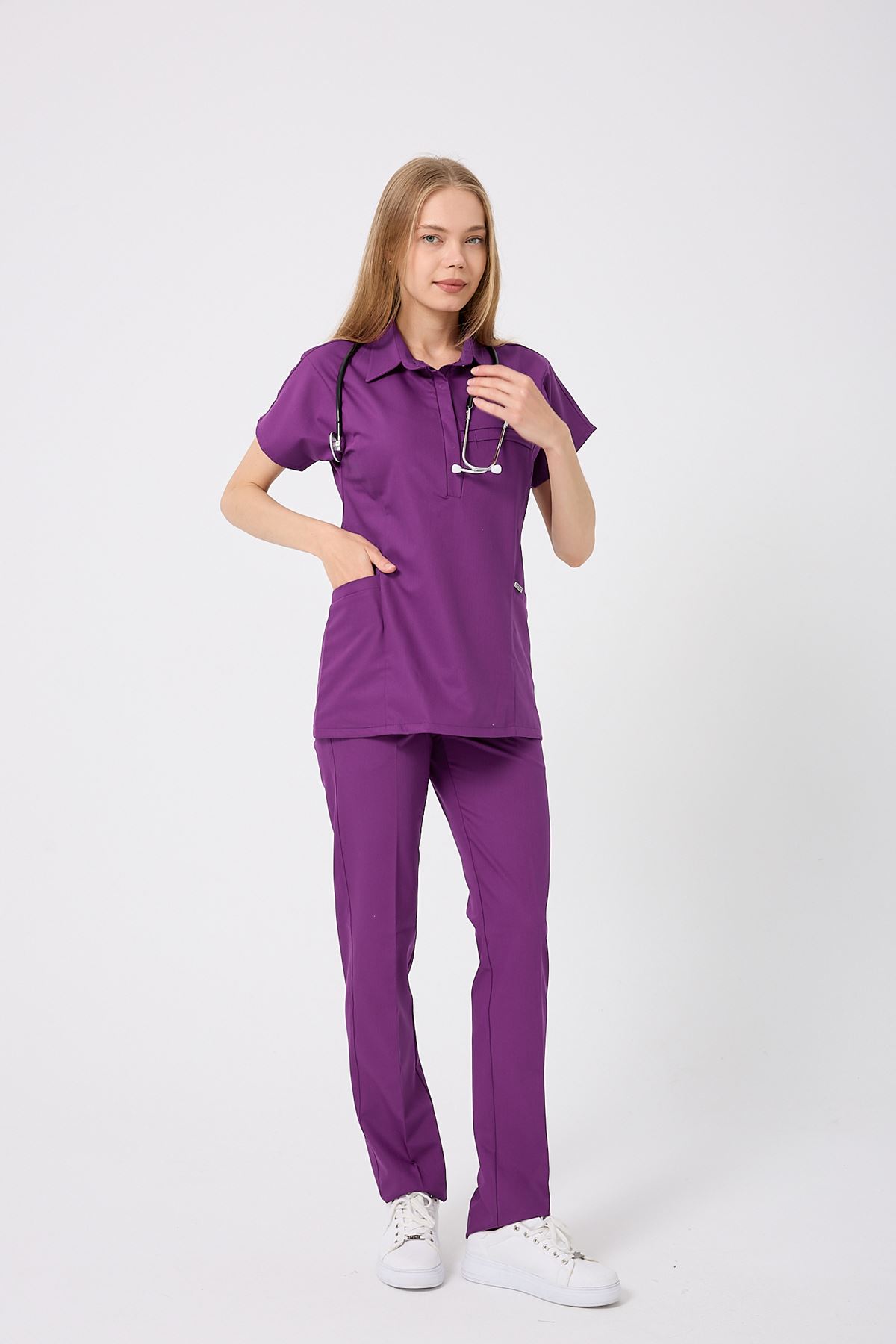 Planet koleksiyonunun Eflatun takımı; sıcak tonları, zamansız kalıbı ve kaliteli kumaşıyla dikkat çeker. Kliniklerde veya muayenehanelerde şıklığıyla fark yaratır. Sık yıkamalarda formunu korur, uzun ömürlü kullanım sunar. Sadelikten vazgeçmeyen sağlık çalışanları için zarif bir seçenektir.