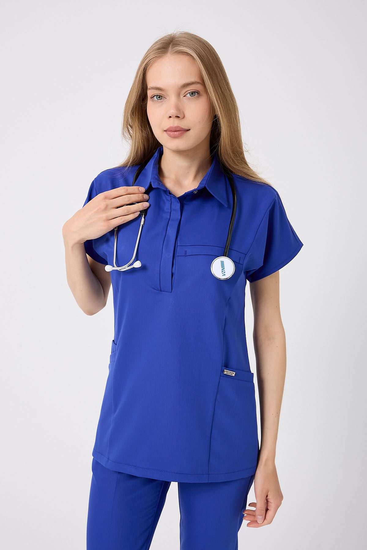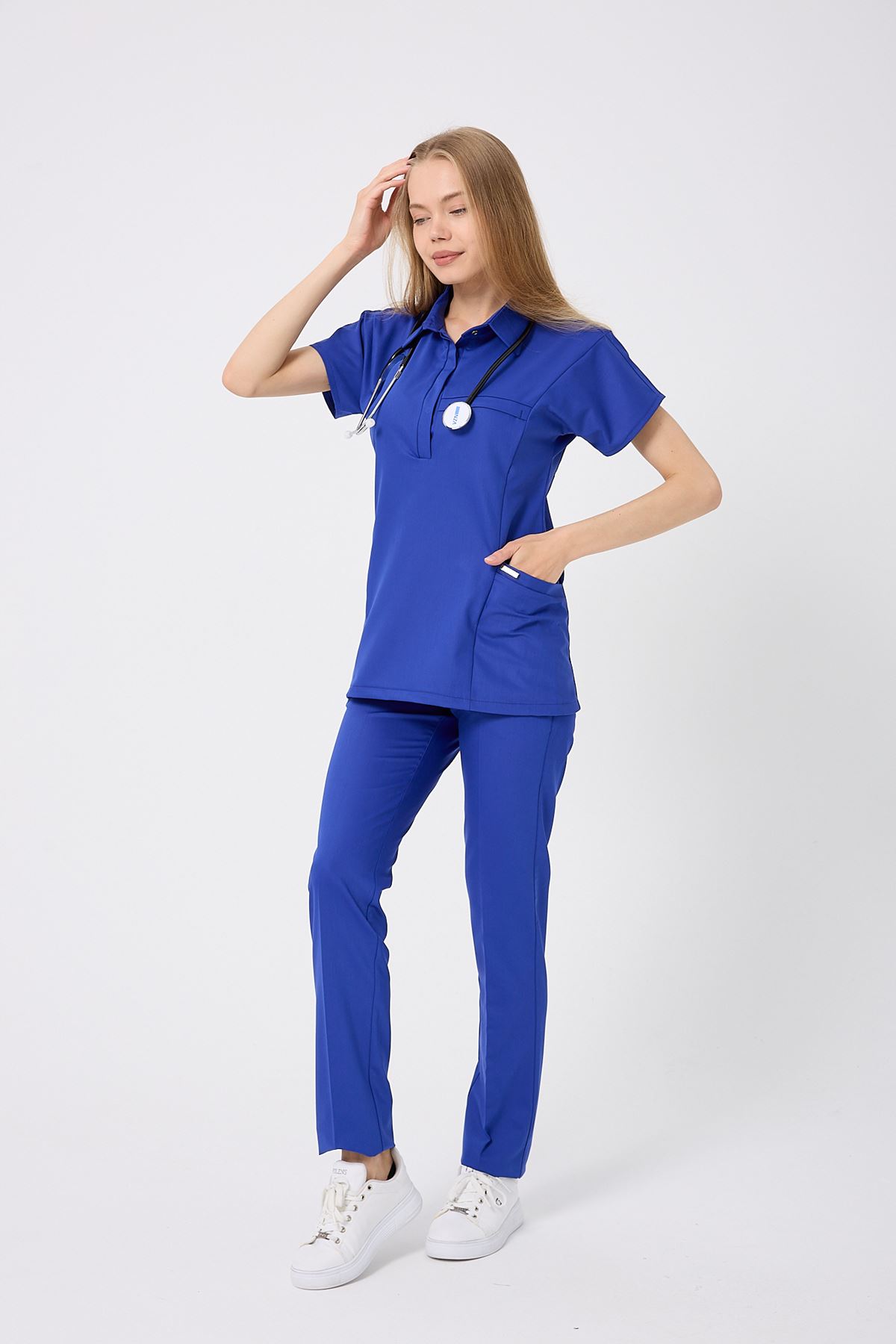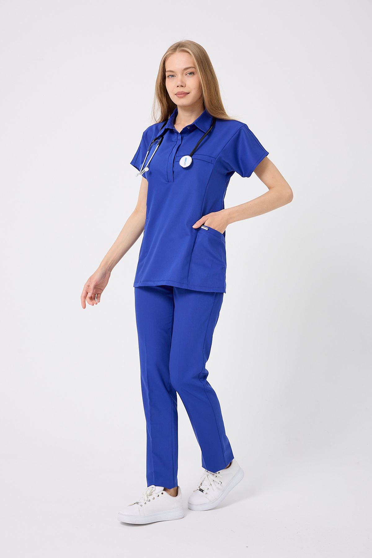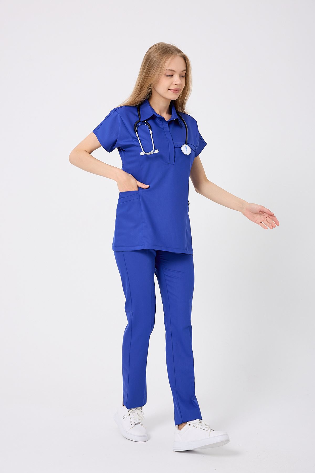 Planet Kadın Takım, dikkat çekici Saks Mavi rengiyle enerjik bir stil sunar. Bu modern ton, hareketli çalışma ortamlarında bile stilinden ödün vermek istemeyen sağlık profesyonelleri için idealdir. Hafif viskon karışımlı kumaşı %11-14 rutubet toplar, %80- su emer ve %15-30 esneme kabiliyetiyle gün boyu konfor sağlar. Sık yıkamalara rağmen renk canlılığını korur.
