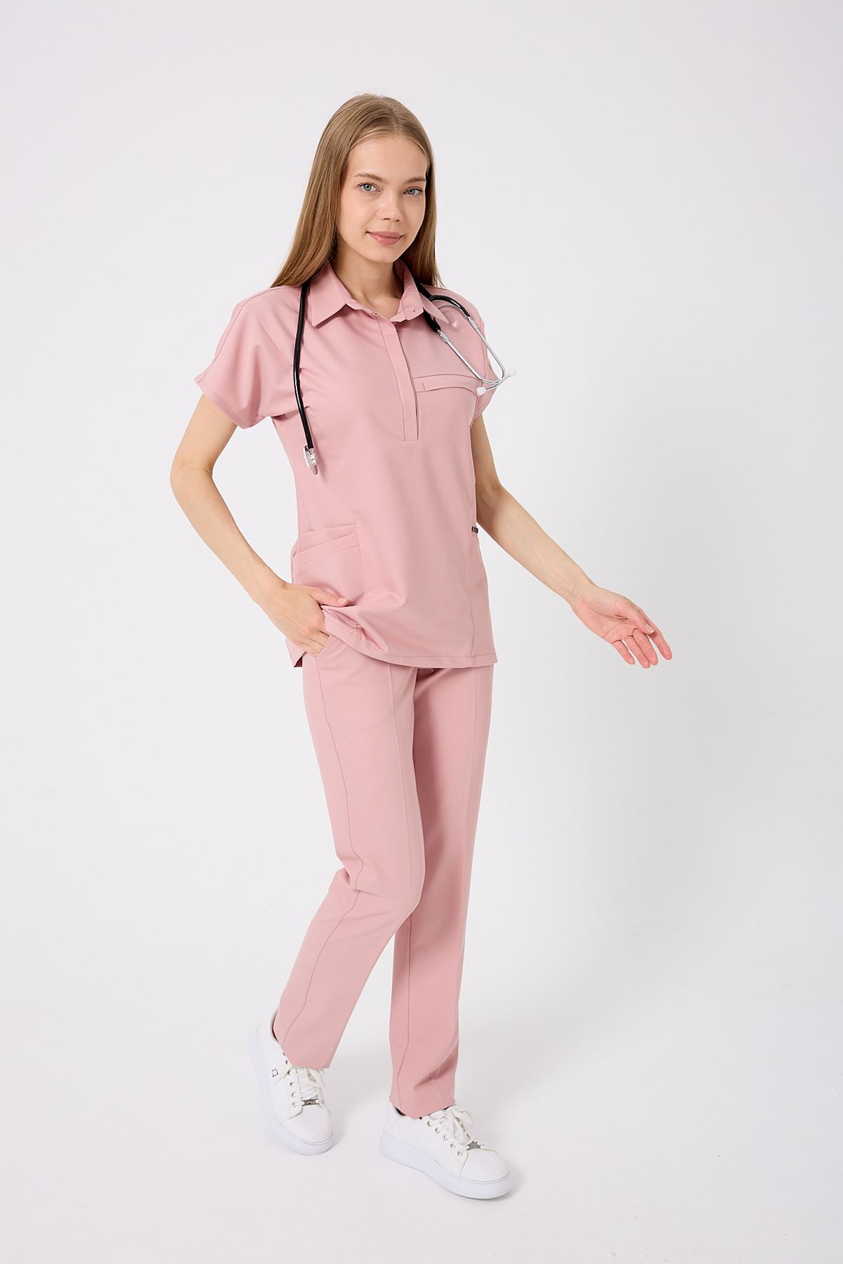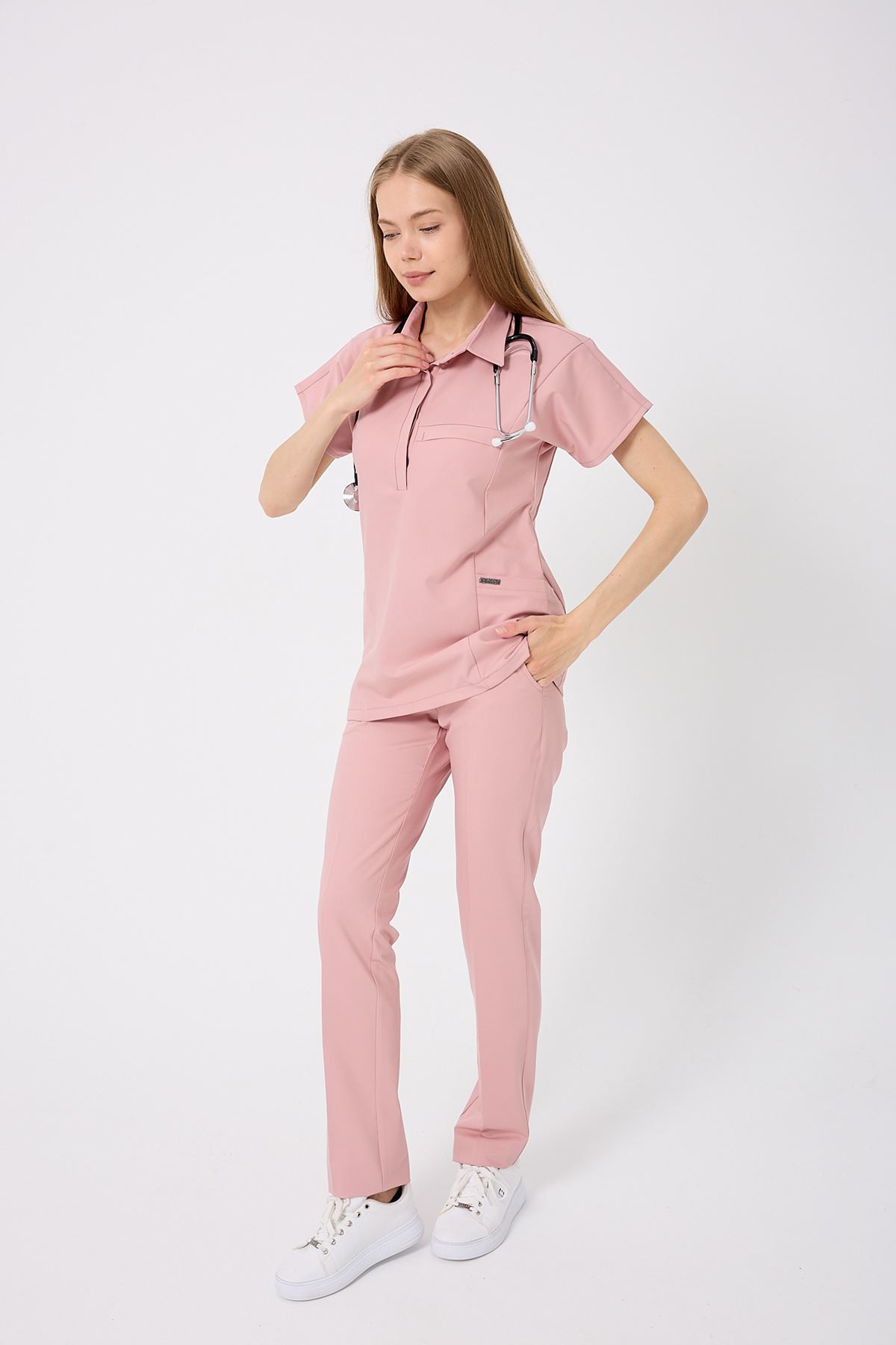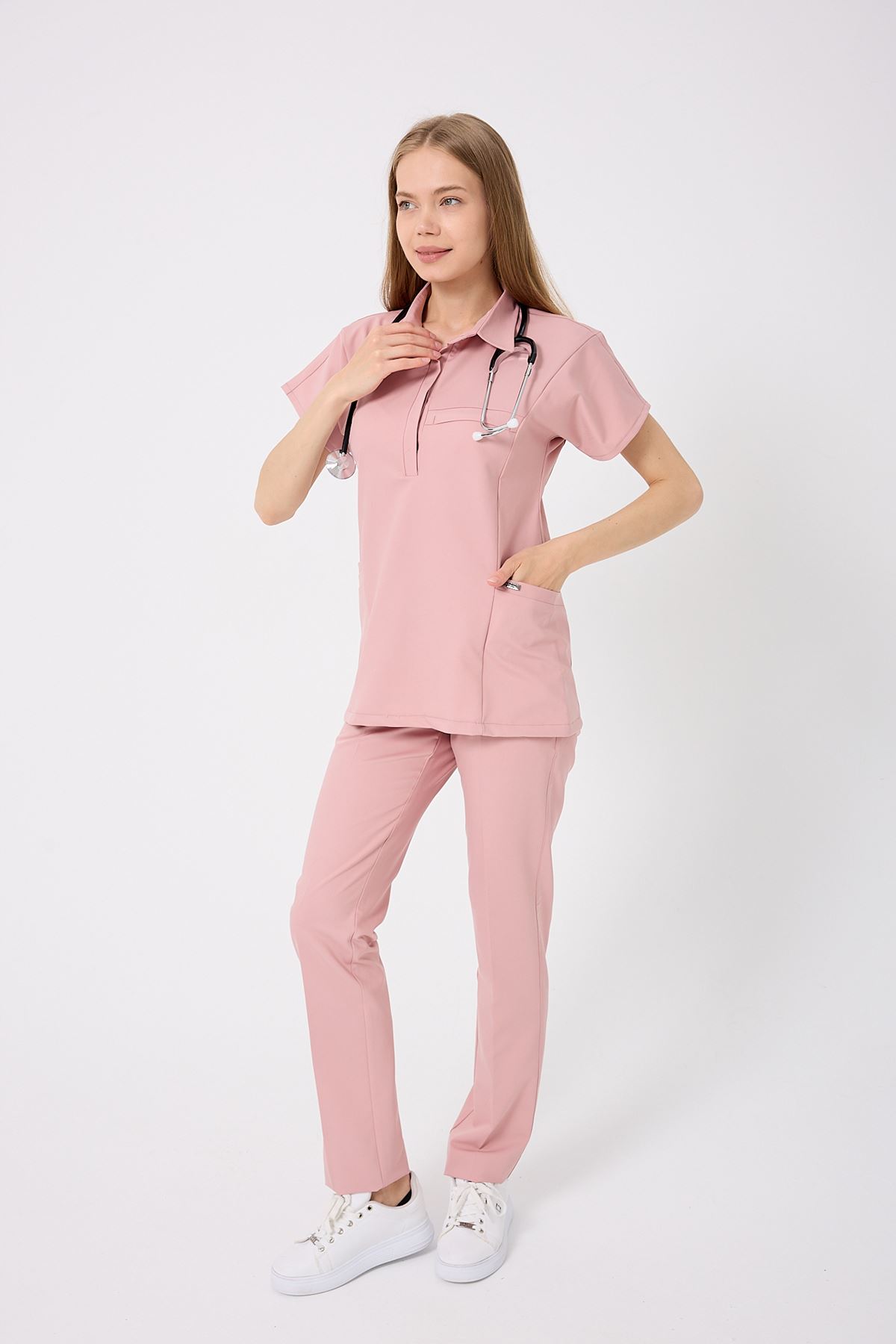 Planet Kadın Takım, romantik Pudra rengiyle yumuşak ve feminen bir görünüm sunar. Nefes alabilir kumaşı, uzun vardiyalarda bile maksimum rahatlık sağlar. Viskon karışımlı yapısı %11-14 rutubet toplar, %80- su emer, %15-30 esneme oranı ile hareket özgürlüğünü destekler. Pudra tonunun yumuşak dokusu, her ortama uyum sağlar.