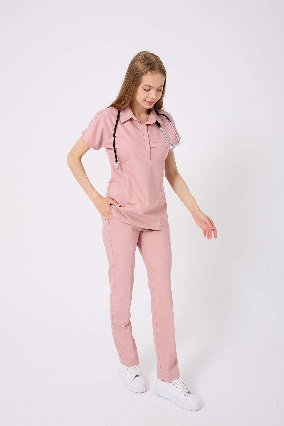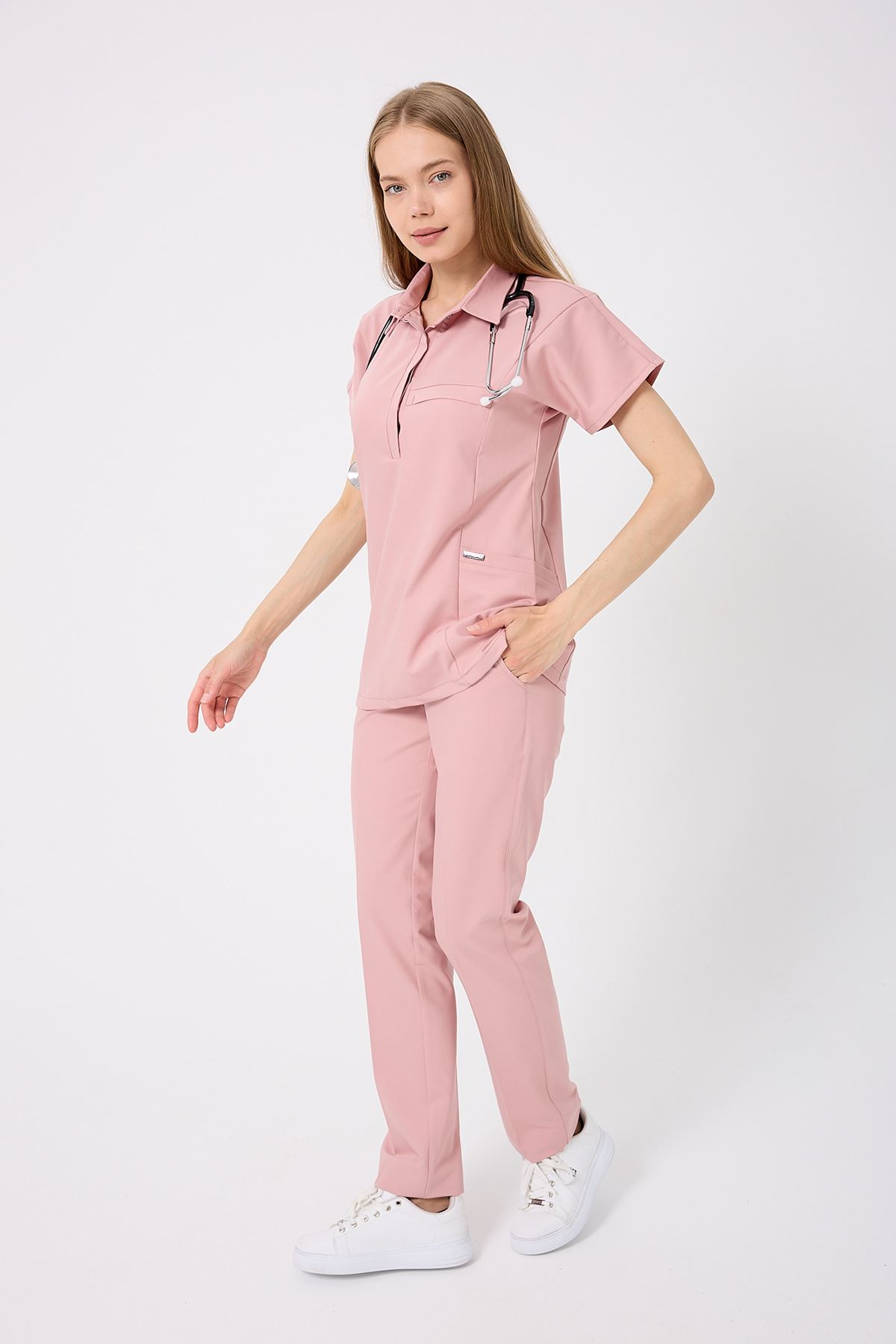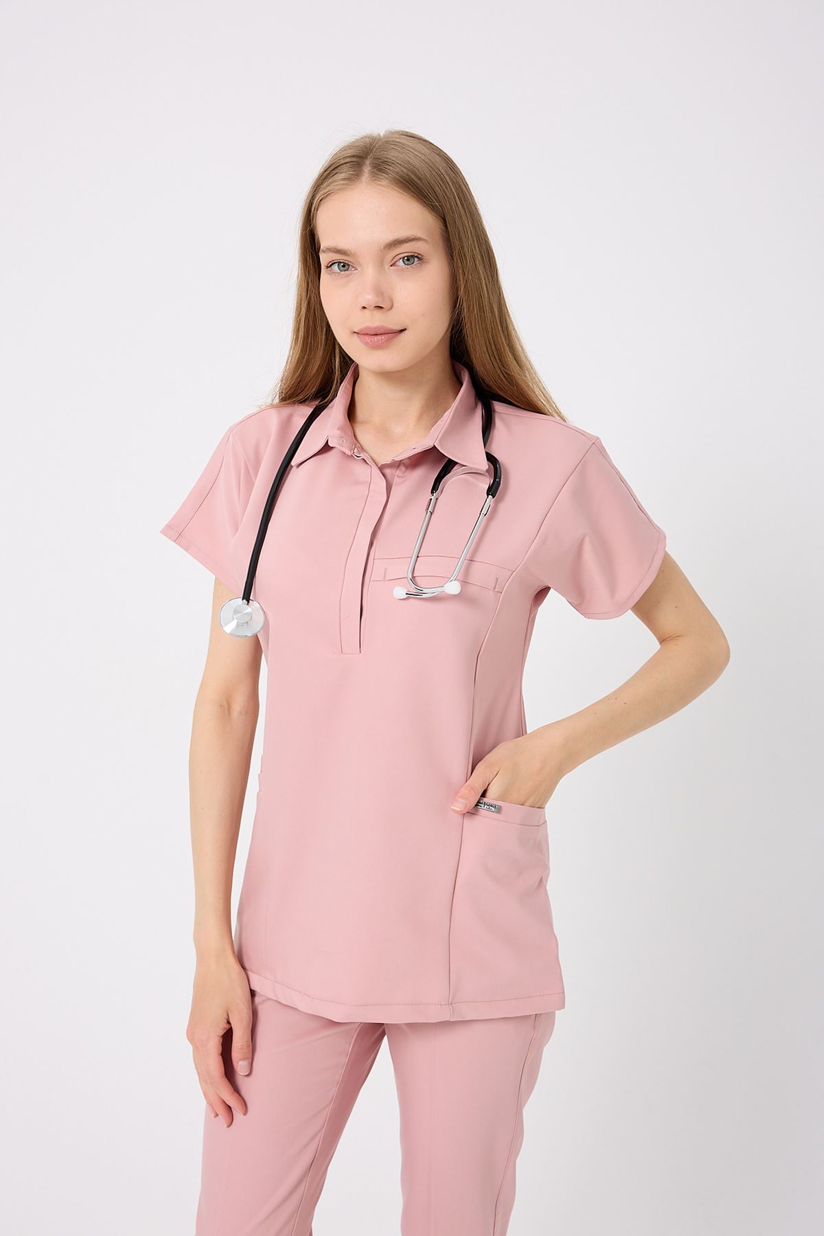 Planet Kadın Takım, romantik Pudra rengiyle yumuşak ve feminen bir görünüm sunar. Nefes alabilir kumaşı, uzun vardiyalarda bile maksimum rahatlık sağlar. Viskon karışımlı yapısı %11-14 rutubet toplar, %80- su emer, %15-30 esneme oranı ile hareket özgürlüğünü destekler. Pudra tonunun yumuşak dokusu, her ortama uyum sağlar.