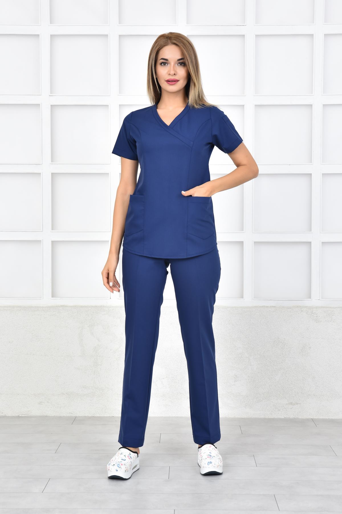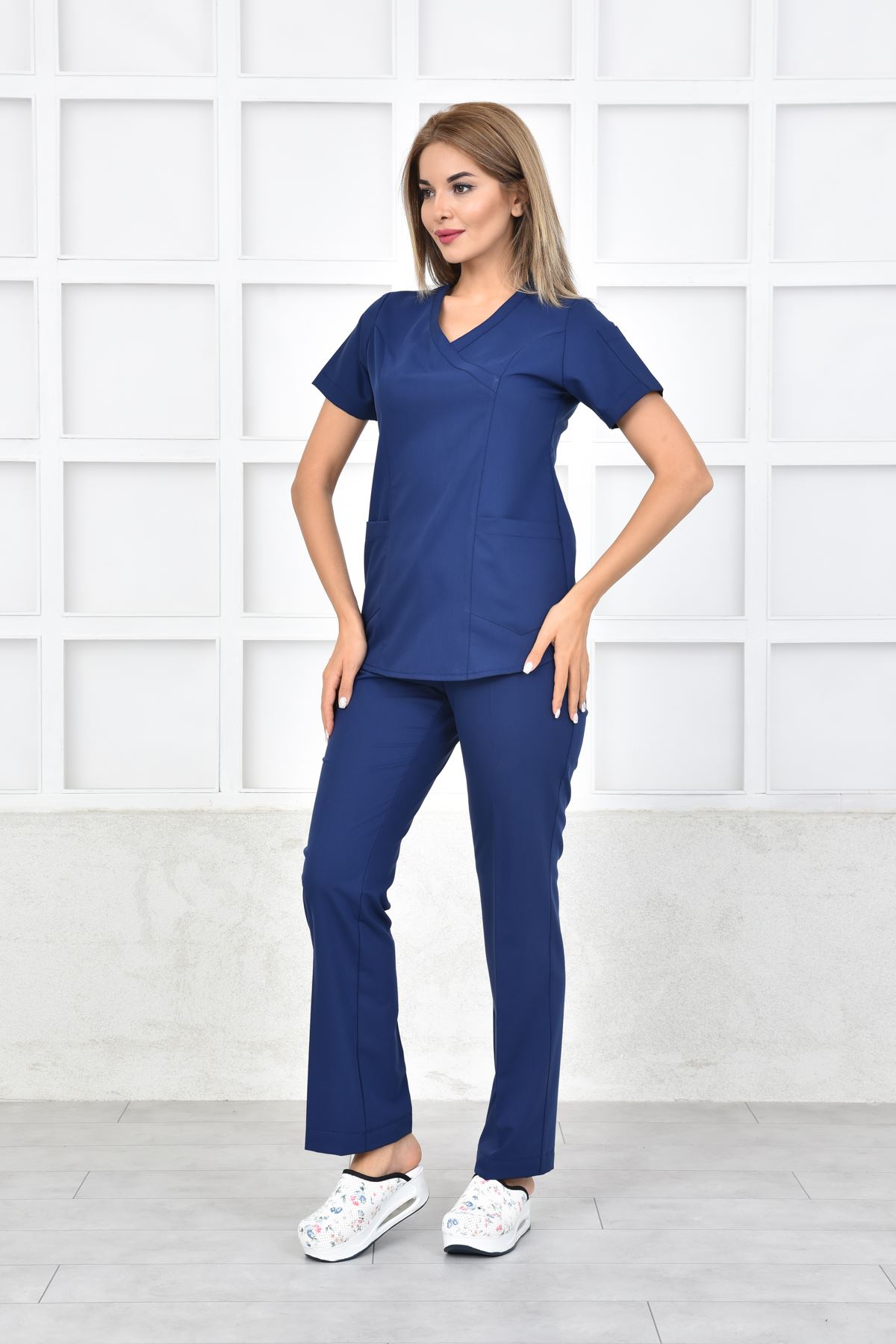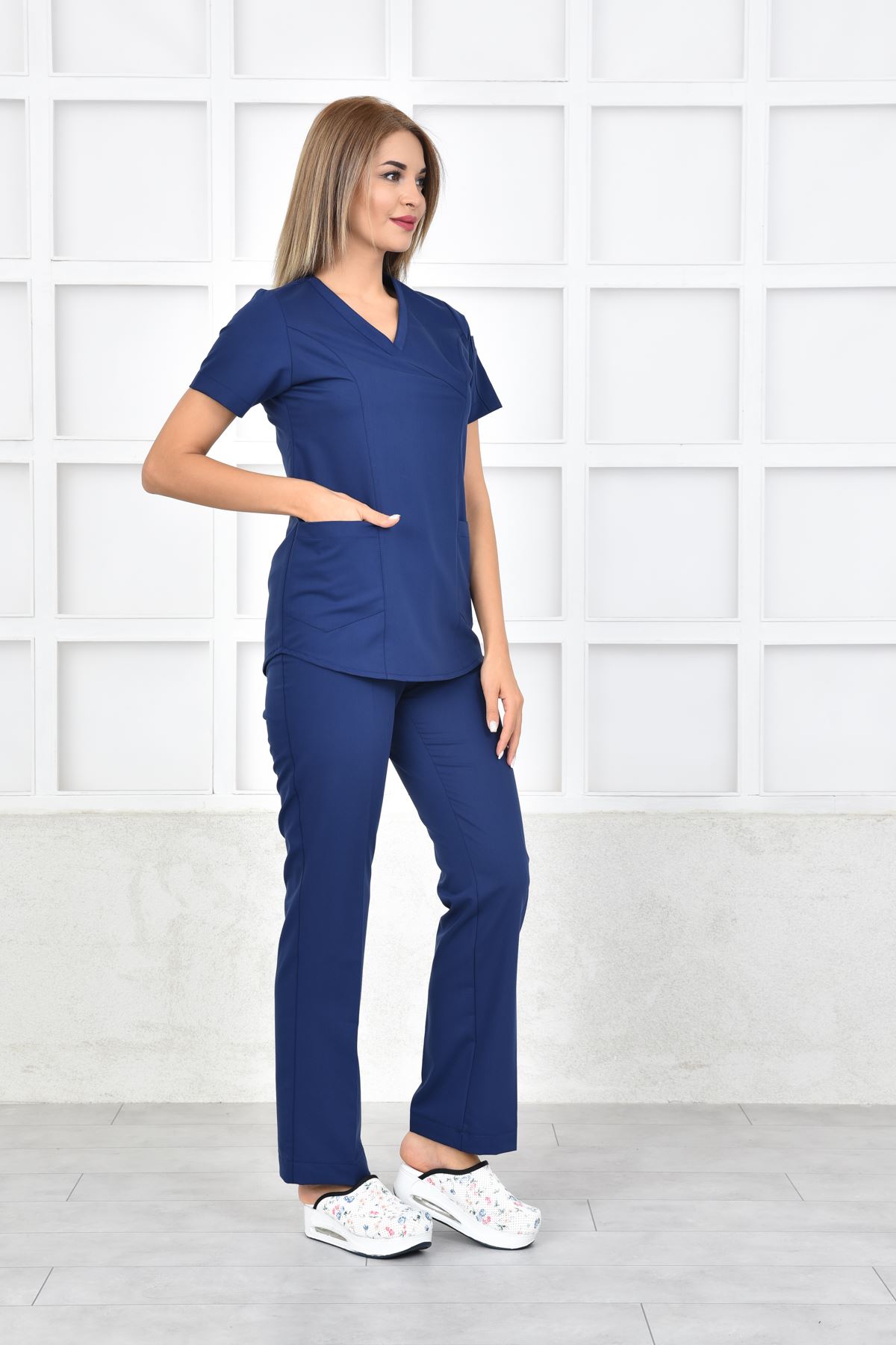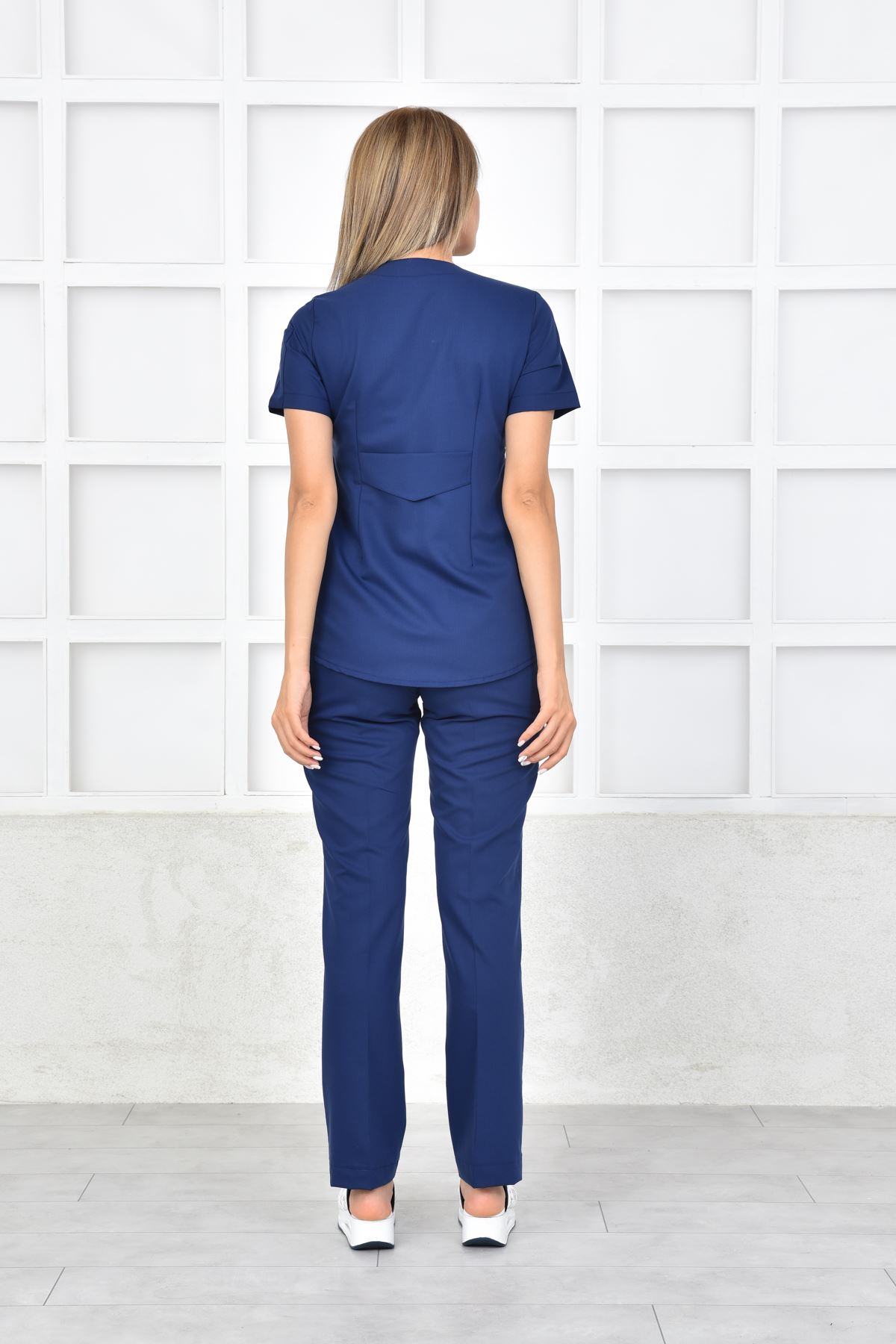İndigo rengi formaya güçlü ve sakin bir görünüm katar. Kaygan yüzeyli viskon dokusu, ütü gerektirmez ve konforu artırır. Rahat kalıbı, tüm medikal ortamlarda şık bir tercih sunar.
